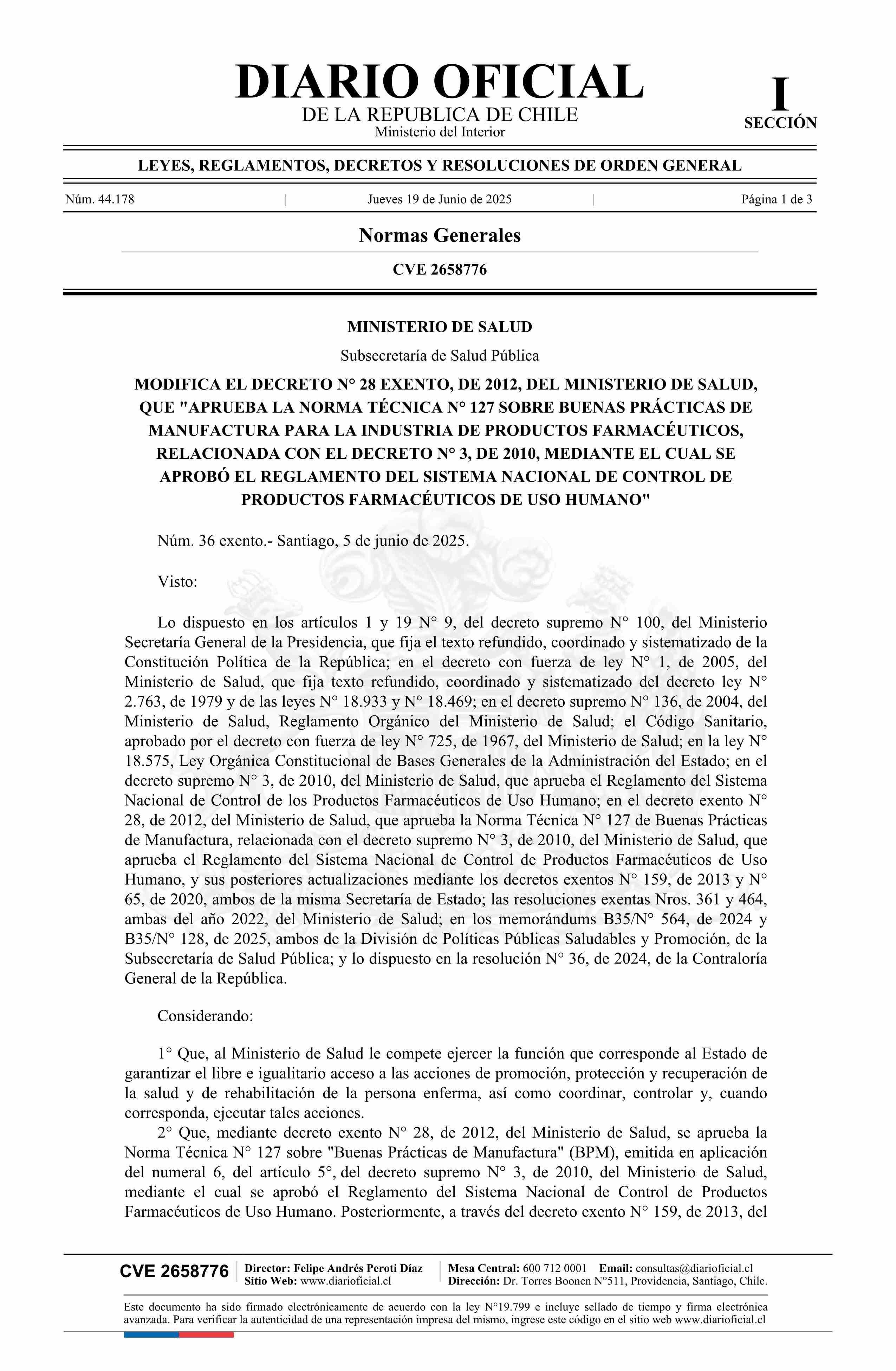 | Título: | Decreto exento número 36, de 2025.- Modifica el decreto N° 28 exento, de 2012, que aprueba la Norma Técnica N° 127 sobre Buenas Prácticas de Manufactura para la Industria de Productos Farmacéuticos, relacionada con el decreto N° 3, de 2010, mediante el cual se aprobó el Reglamento del Sistema Nacion |