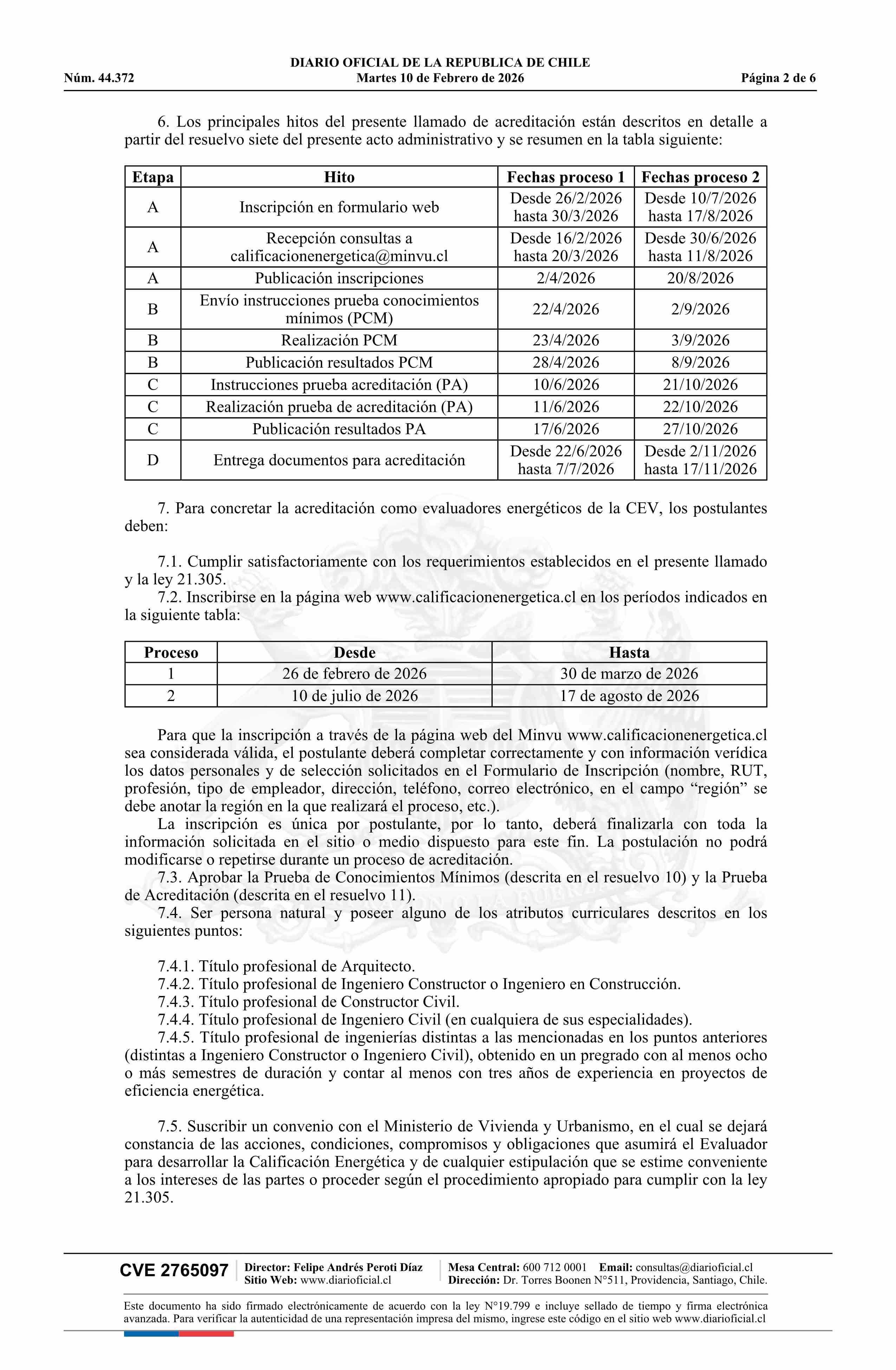 | Título: | Resolución exenta número 178, de 2026.- Llama a postulación para la acreditación de profesionales para que actúen como evaluadores energéticos de la calificación energética de viviendas en Chile |