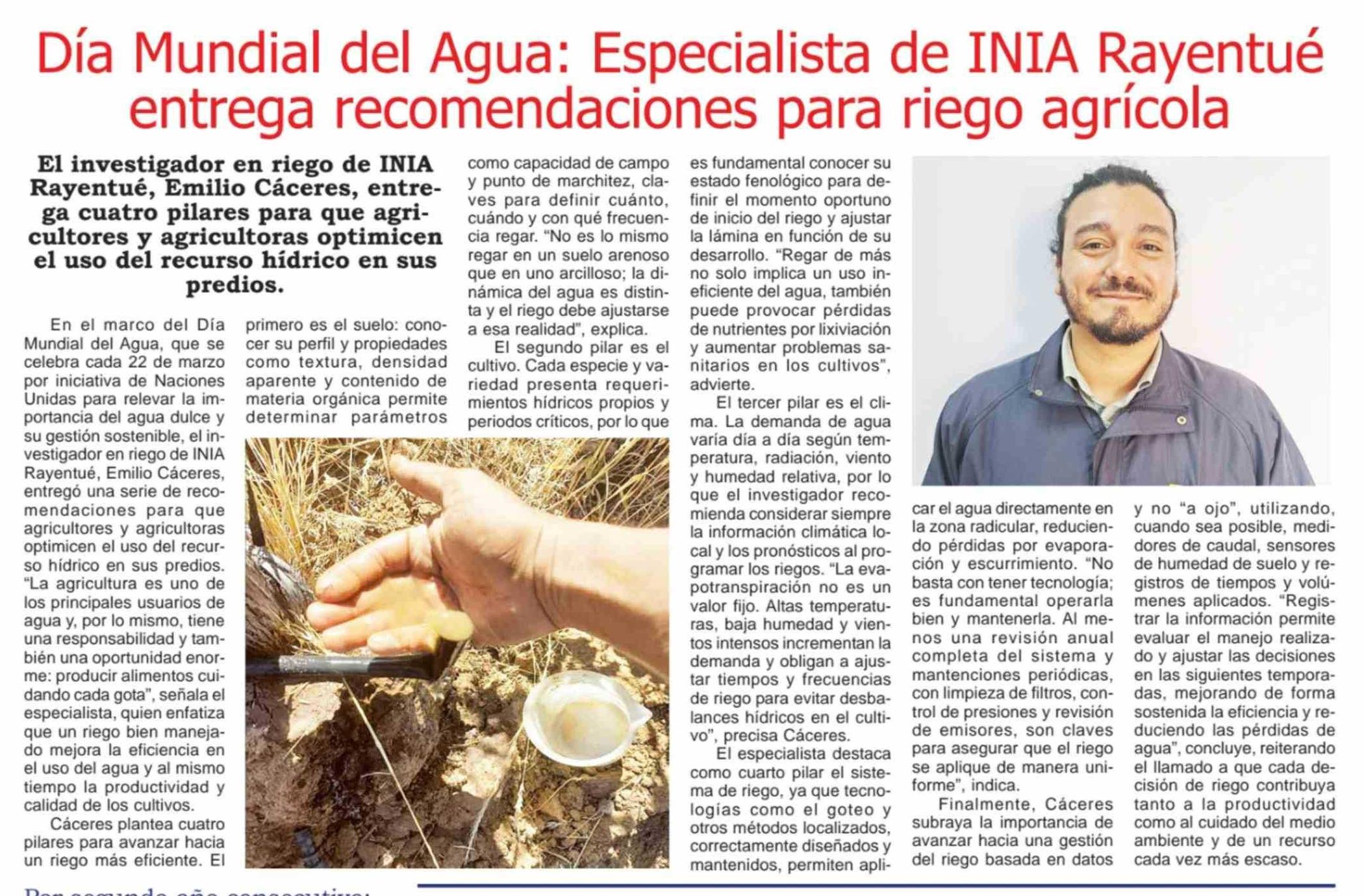 Día Mundial del Agua: Especialista de INIA Rayentué entrega recomendaciones para riego agrícola