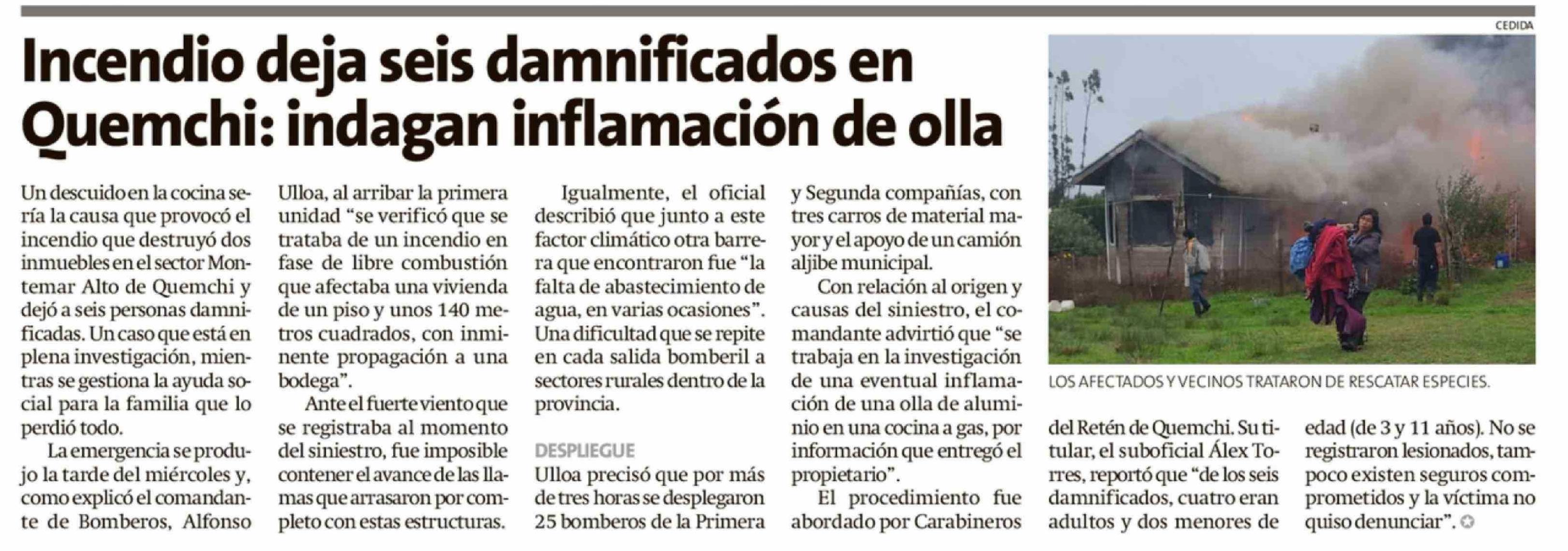 Incendio deja seis damnificados en Quemchi: indagan inflamación de olla