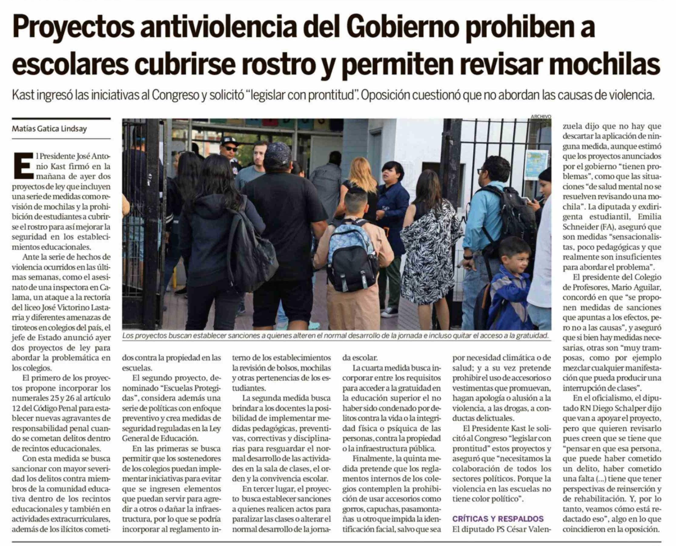 Proyectos antiviolencia del Gobierno prohiben a escolares cubrirse rostro y permiten revisar mochilas