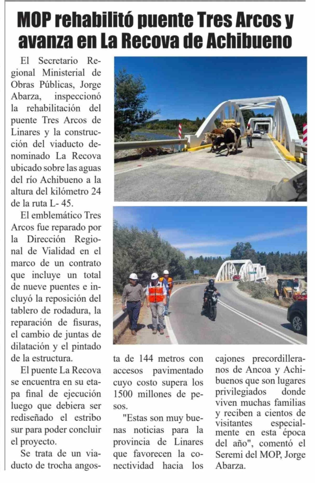 MOP rehabilitó puente Tres Arcos y avanza en La Recova de Achibueno