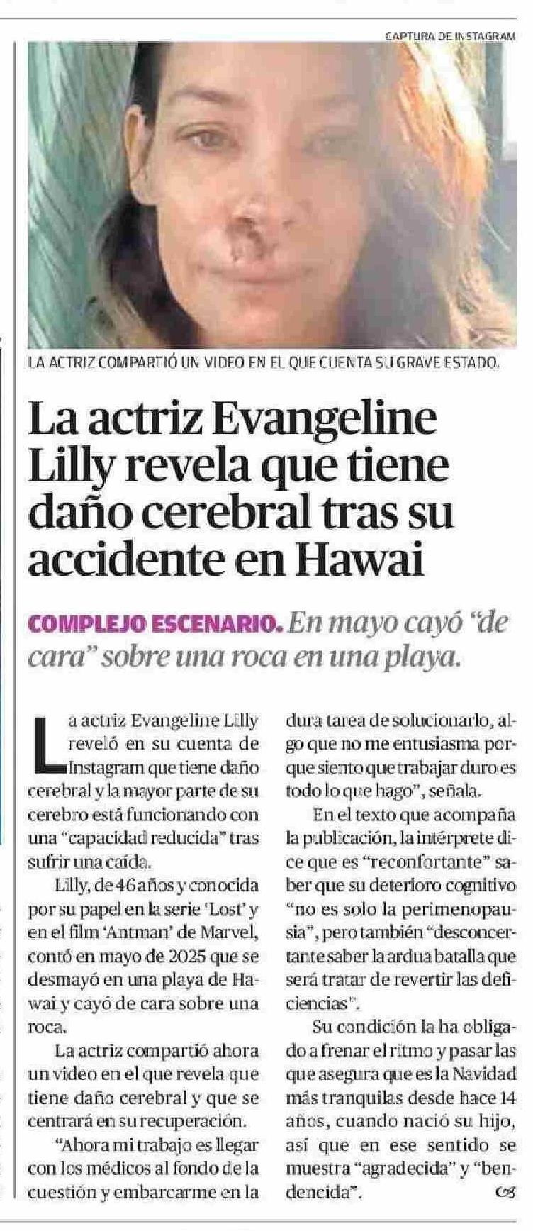 La actriz Evangeline Lilly revela que tiene daño cerebral tras su accidente en Hawai