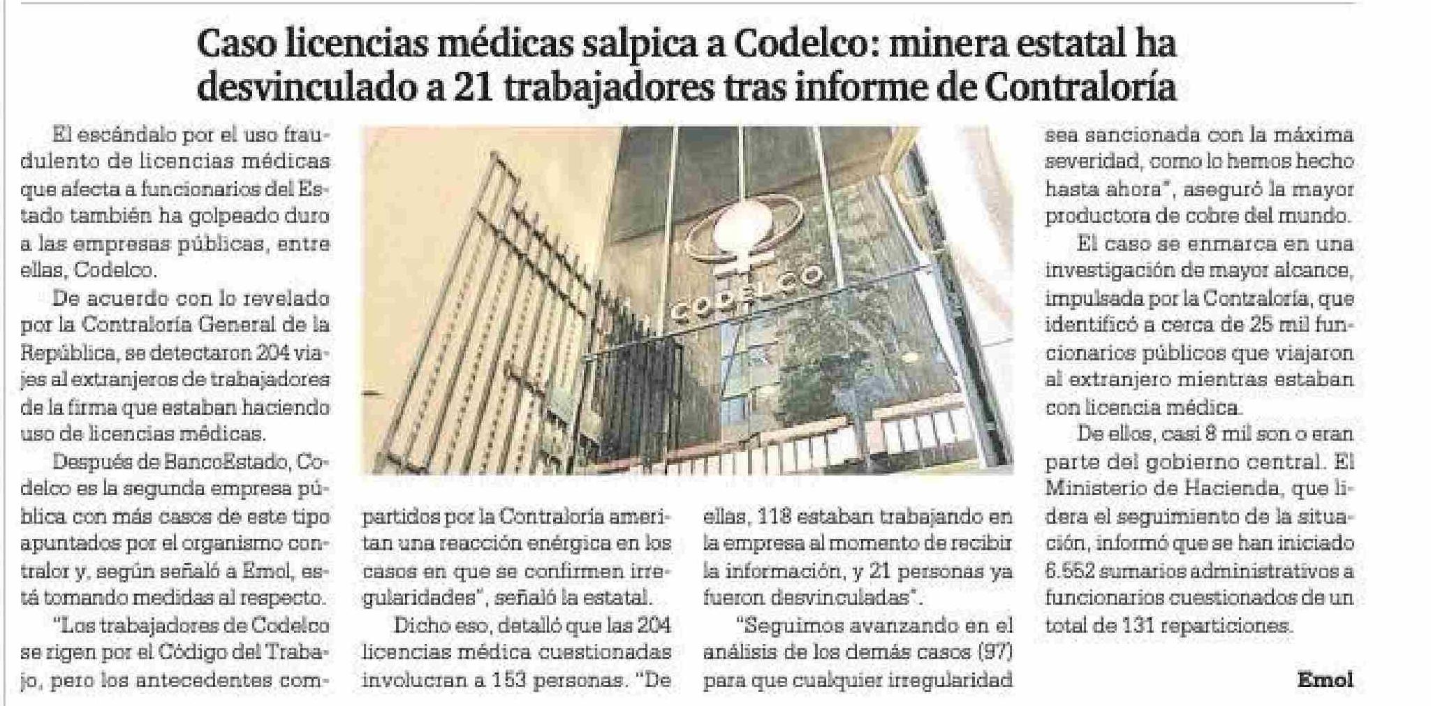 Caso licencias médicas salpica a Codelco: minera estatal ha desvinculado a 21 trabajadores tras informe de Contraloría