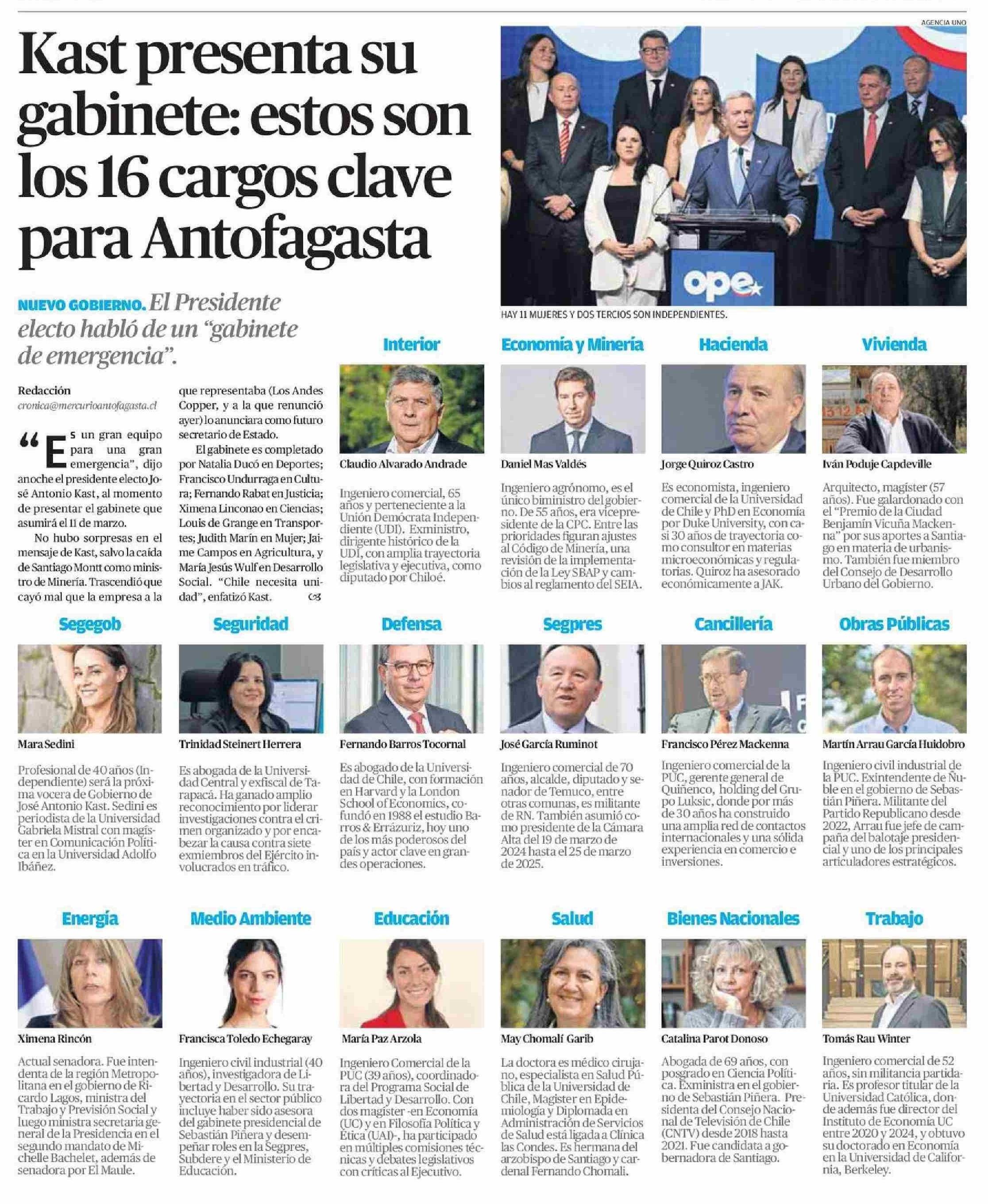Kast presenta su gabinete: estos son los 16 cargos clave para Antofagasta