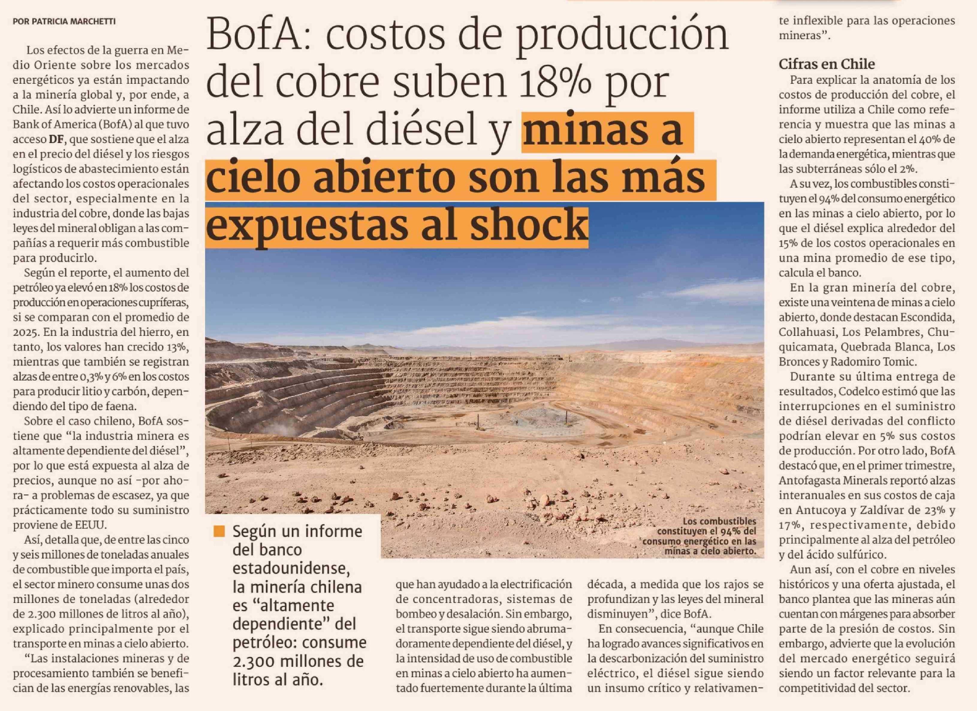 BofA: costos de producción del cobre suben 18% por alza del diésel y minas a cielo abierto son las más expuestas al shock