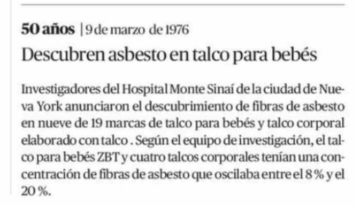 | Título: | 50 años | 9 de marzo de 1976 Descubren asbesto en talco para bebés Investigadores del Hospital Monte Sinaí de la ciudad de Nueva York anunciaron el descubrimiento de fibras de asbesto en nueve de 19 marcas de talco para bebés y talco corporal elaborado con talco . Según el equipo de investigación, e |