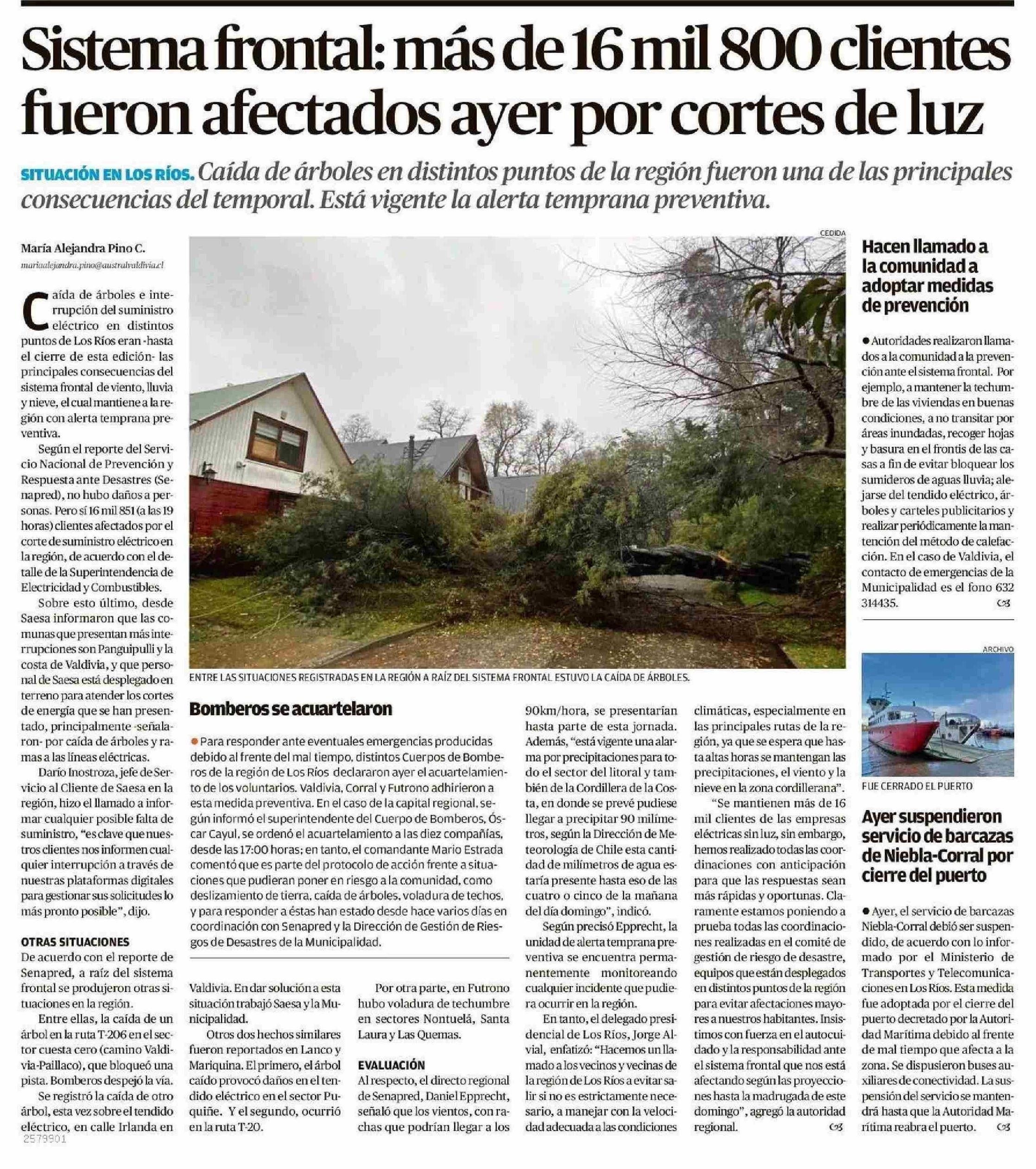 Sistema frontal: más de 16 mil 800 clientes fueron afectados ayer por cortes de luz