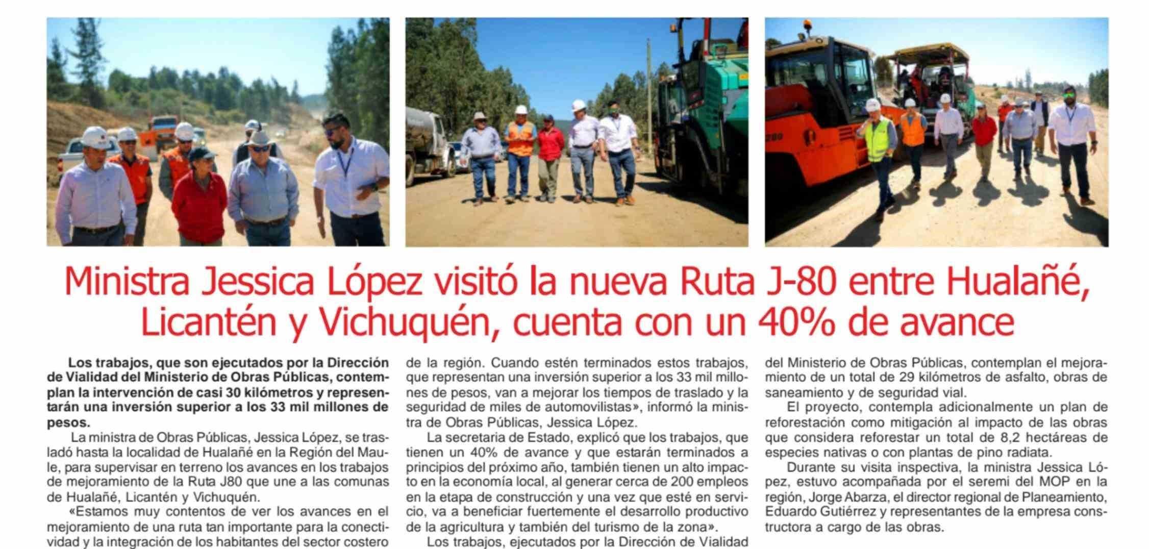 Ministra Jessica López visitó la nueva Ruta J-80 entre Hualañé, Licantén y Vichuquén, cuenta con un 40% de avance