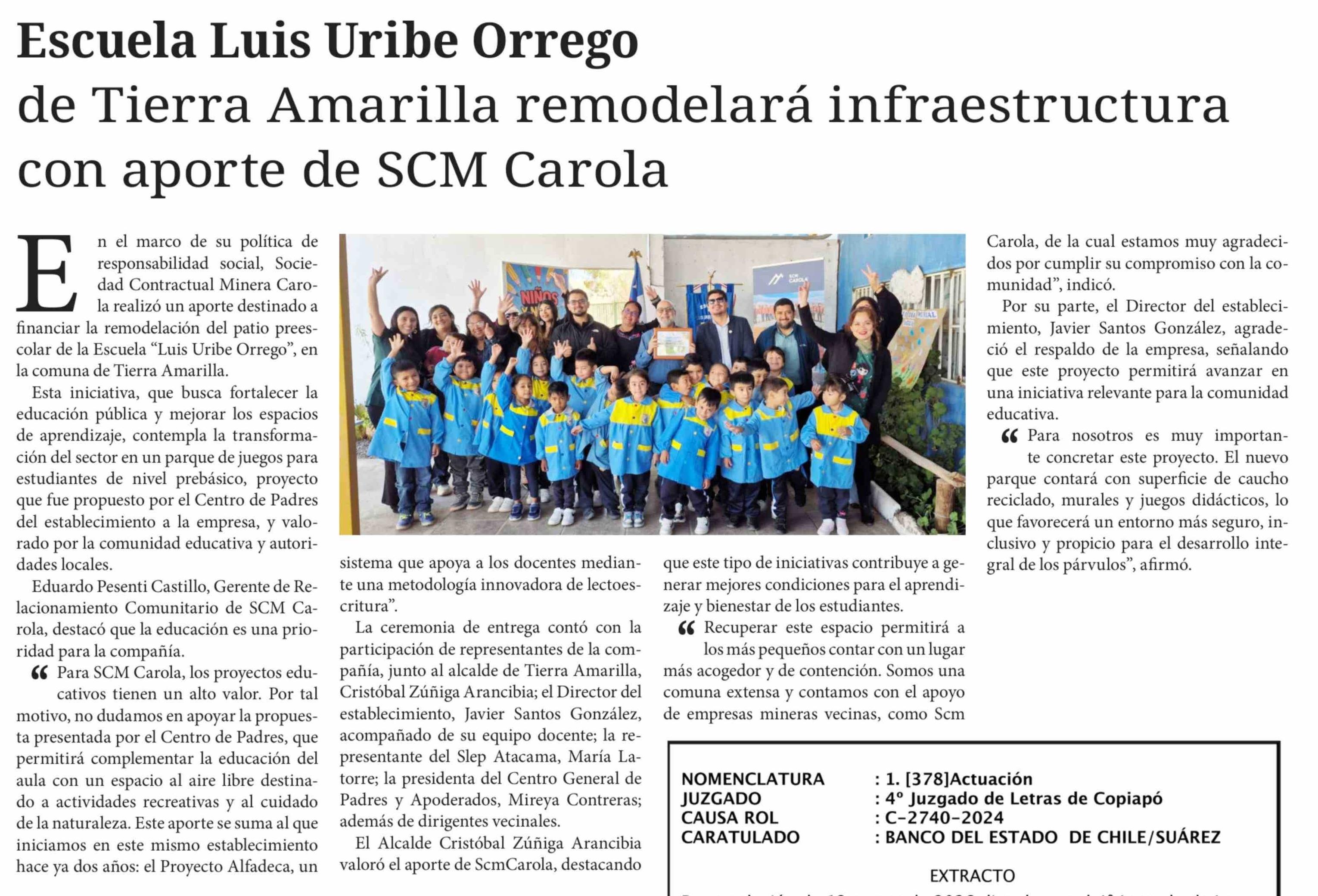 Escuela Luis Uribe Orrego de Tierra Amarilla remodelará infraestructura con aporte de SCM Carola