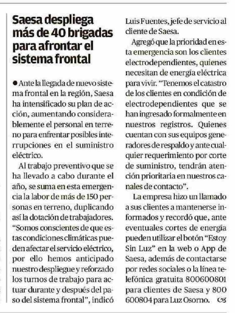 Saesa despliega más de 40 brigadas sistema frontal para afrontar el