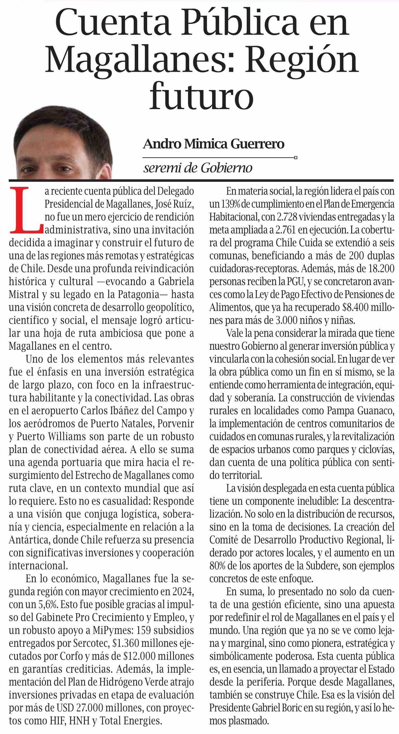 COLUMNAS DE OPINIÓN: Cuenta Pública en Magallanes: Región o futuro