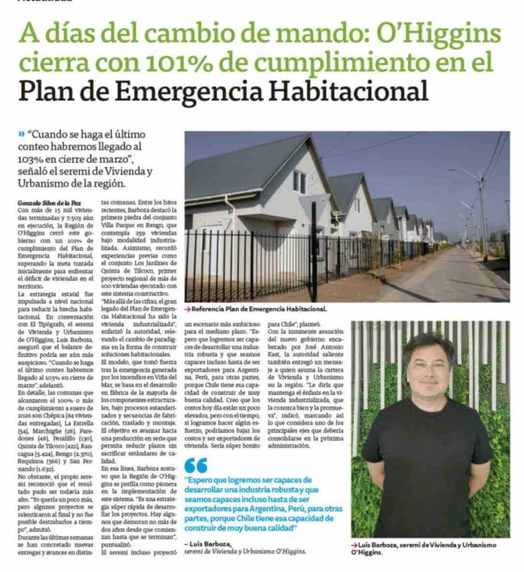A días del cambio de mando: O'Higgins cierra con 101% de cumplimiento en el Plan de Emergencia Habitacional
