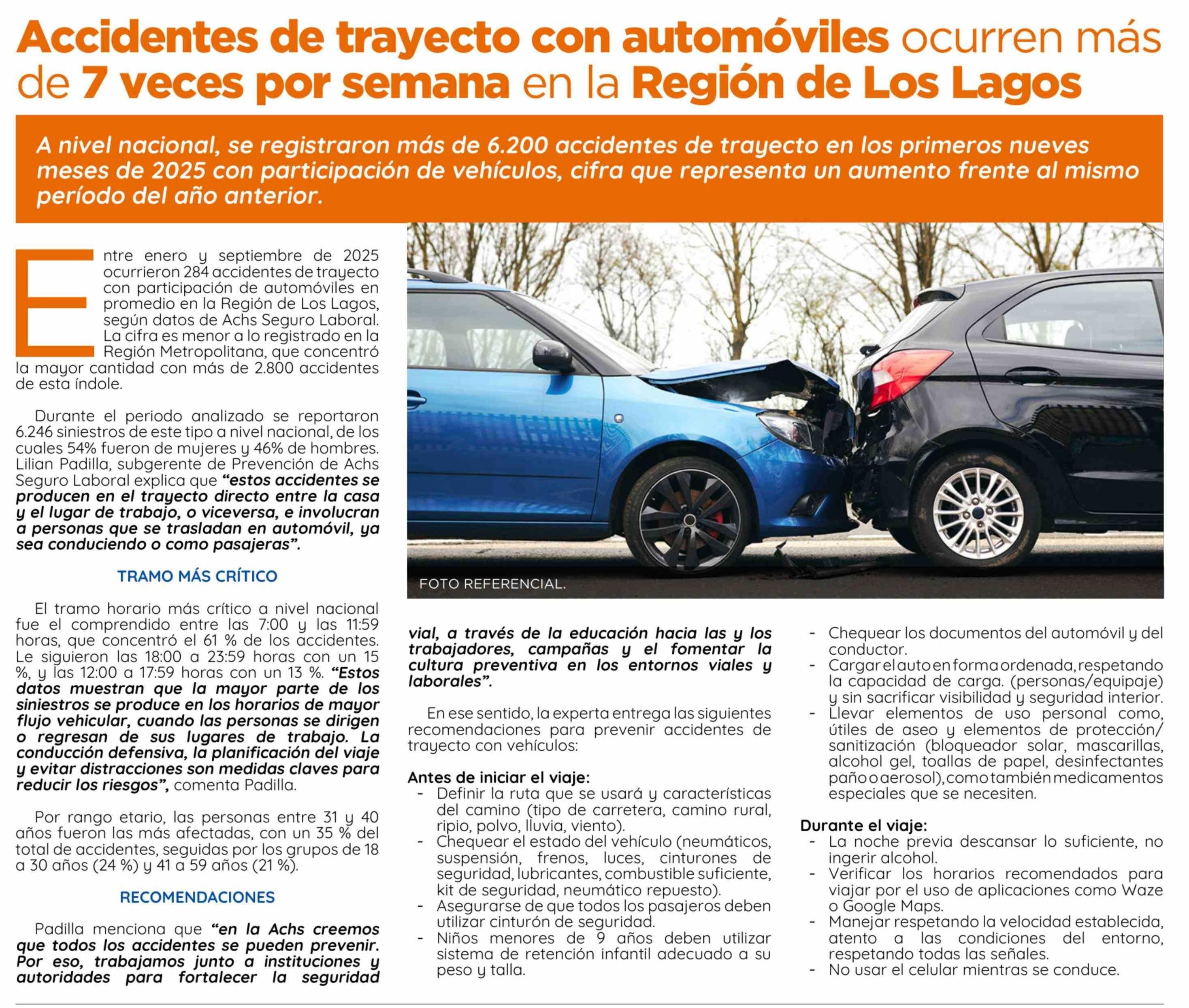 Accidentes de trayecto con automóviles ocurren más de 7 veces por semana en la Región de Los Lagos