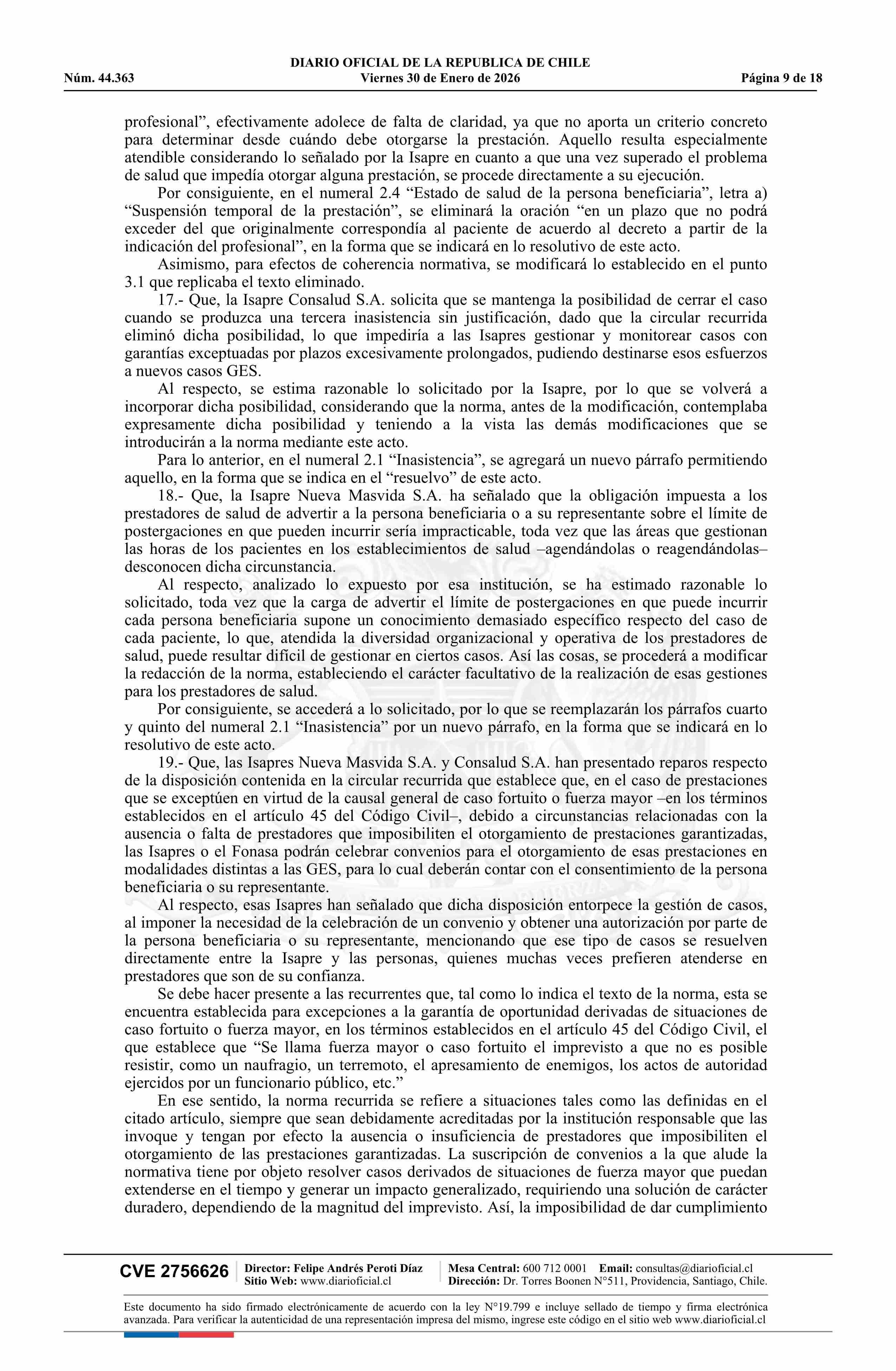 | Título: | Resolución exenta número IF 444, de 2026.- Acoge parcialmente los recursos de reposición deducidos por las isapres Colmena Golden Cross S.A., Nueva Masvida S.A., Cruz Blanca S.A. y Consalud S.A., y por la Subsecretaría de Redes Asistenciales, en contra de la circular IF/N° 501 de 2025 |