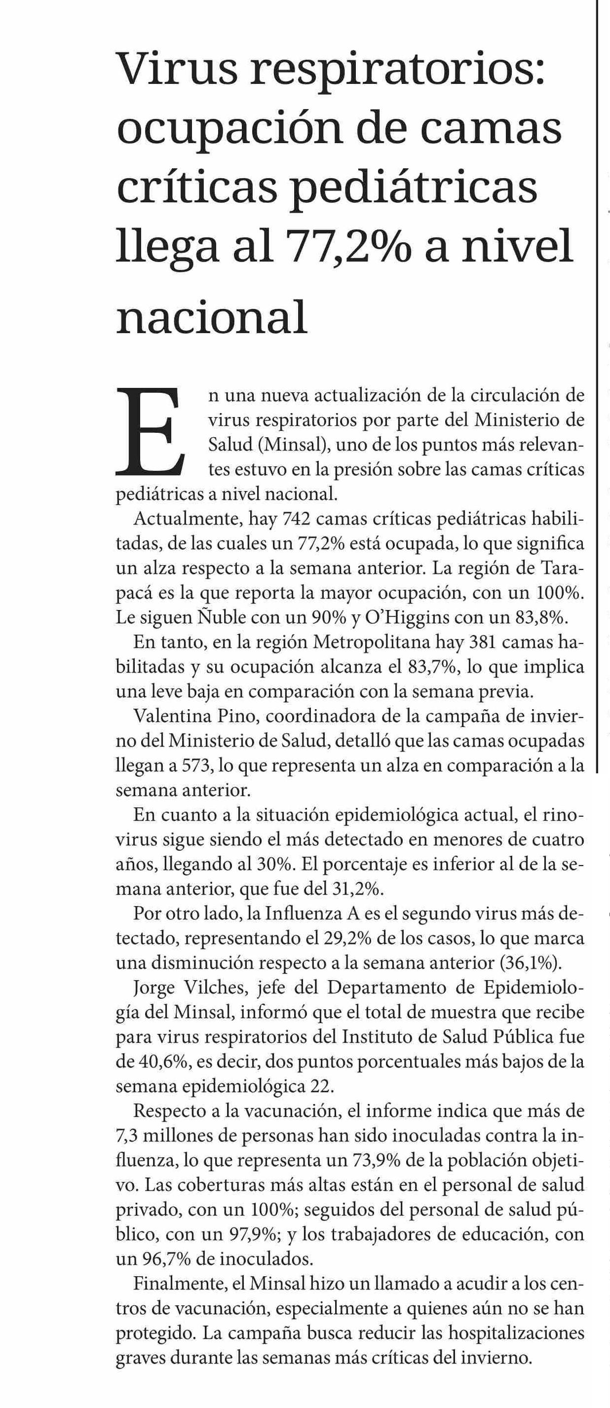 Virus respiratorios: ocupación de camas críticas pediátricas llega al 77,2% a nivel nacional