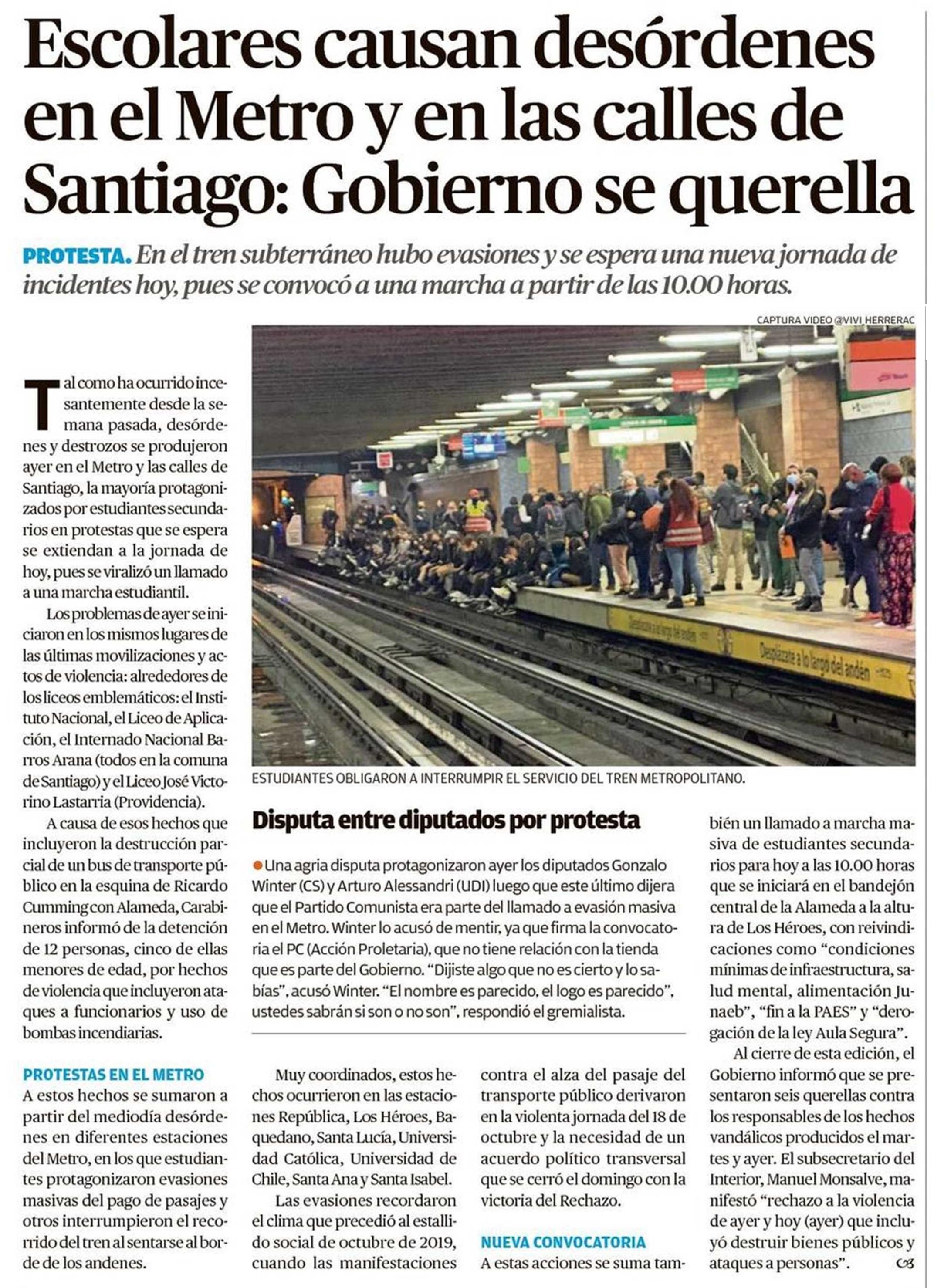 Escolares causan desórdenes en el Metro y en las calles de Santiago: Gobierno se querella