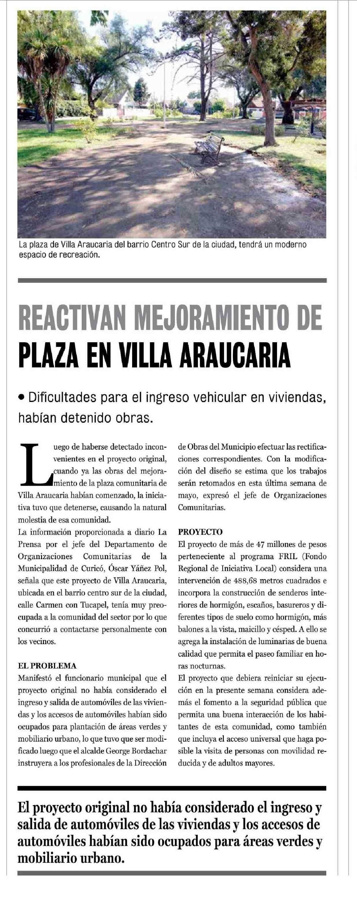 REACTIVAN MEJORAMIENTO DE PLAZA EN VILLA ARAUCARIA