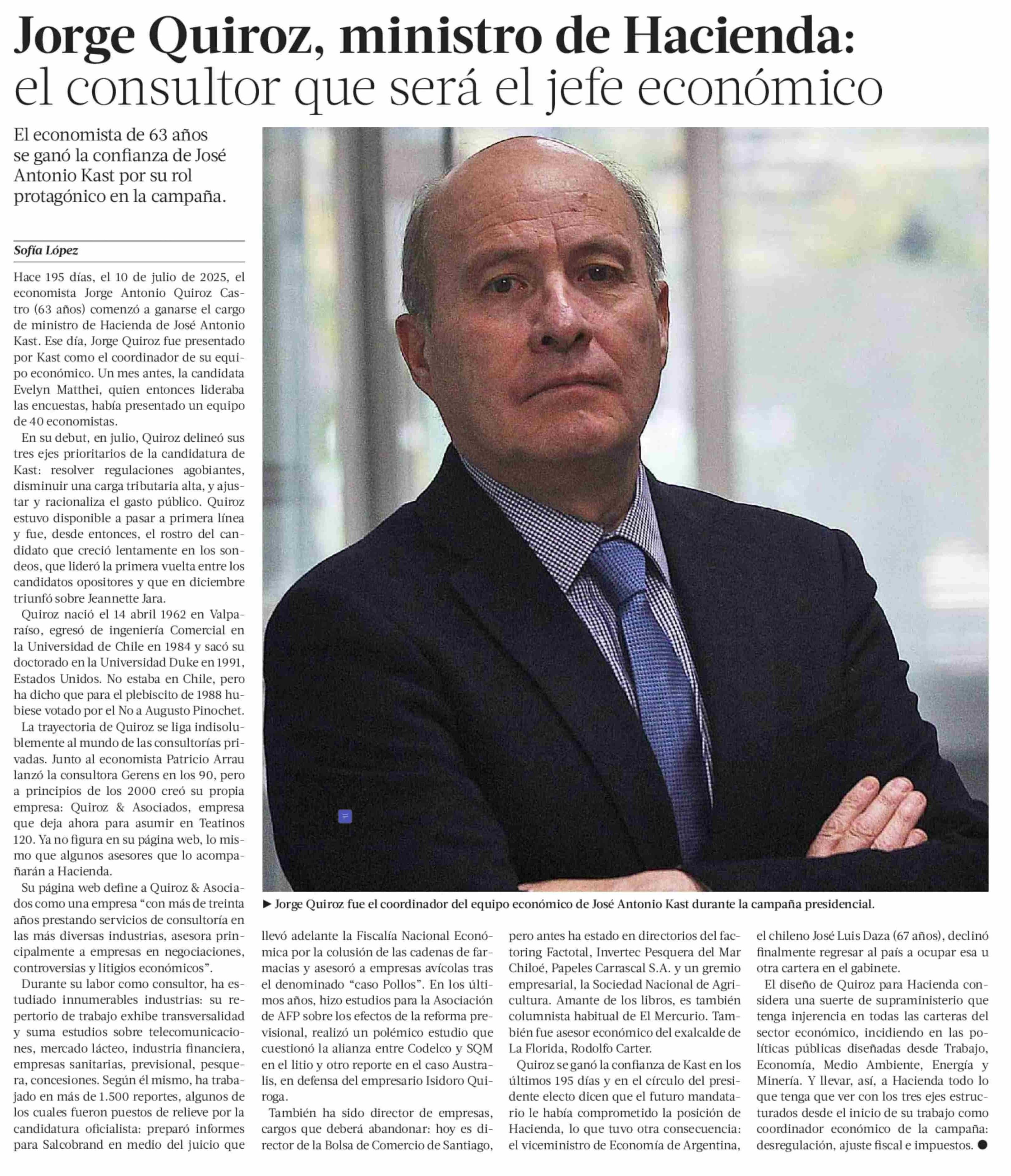 Jorge Quiroz, ministro de Hacienda: el consultor que será el jefe económico