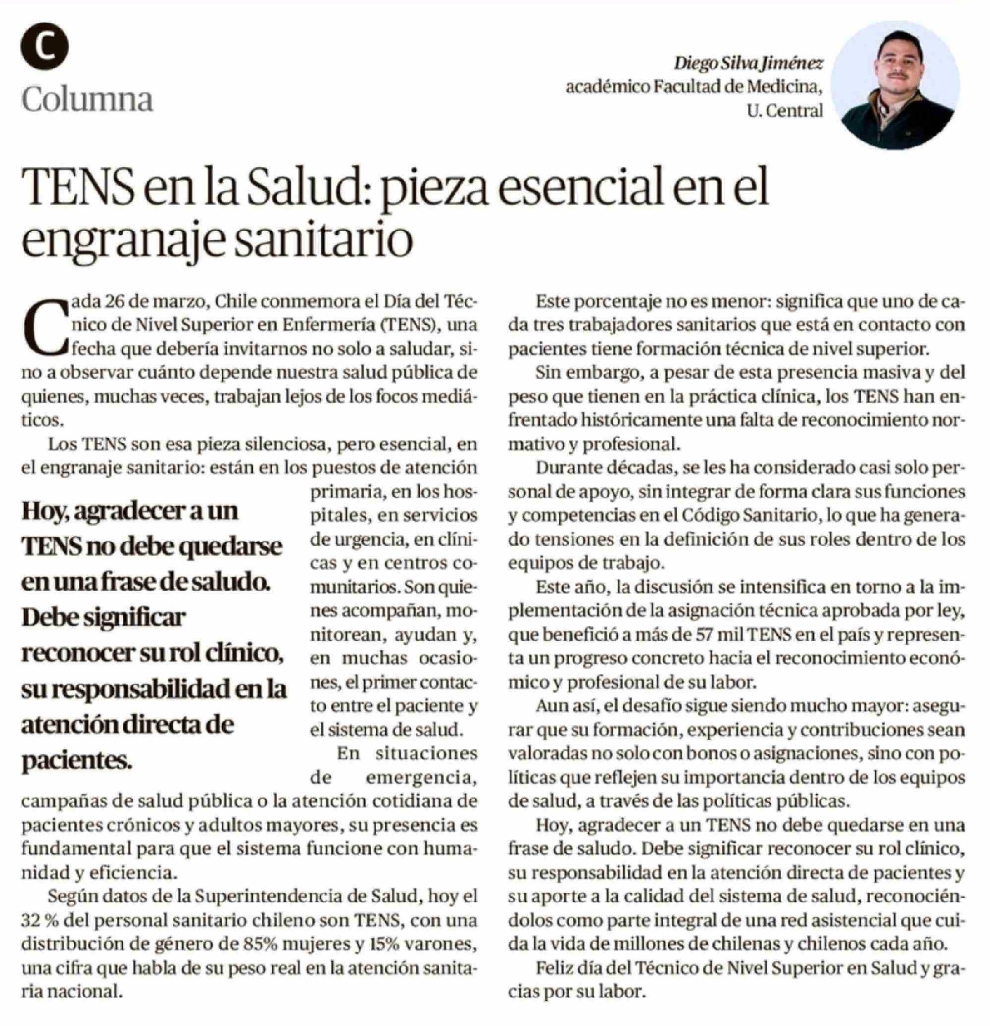 Columnas de Opinión: TENS en la Salud: pieza esencial en el engranaje sanitario