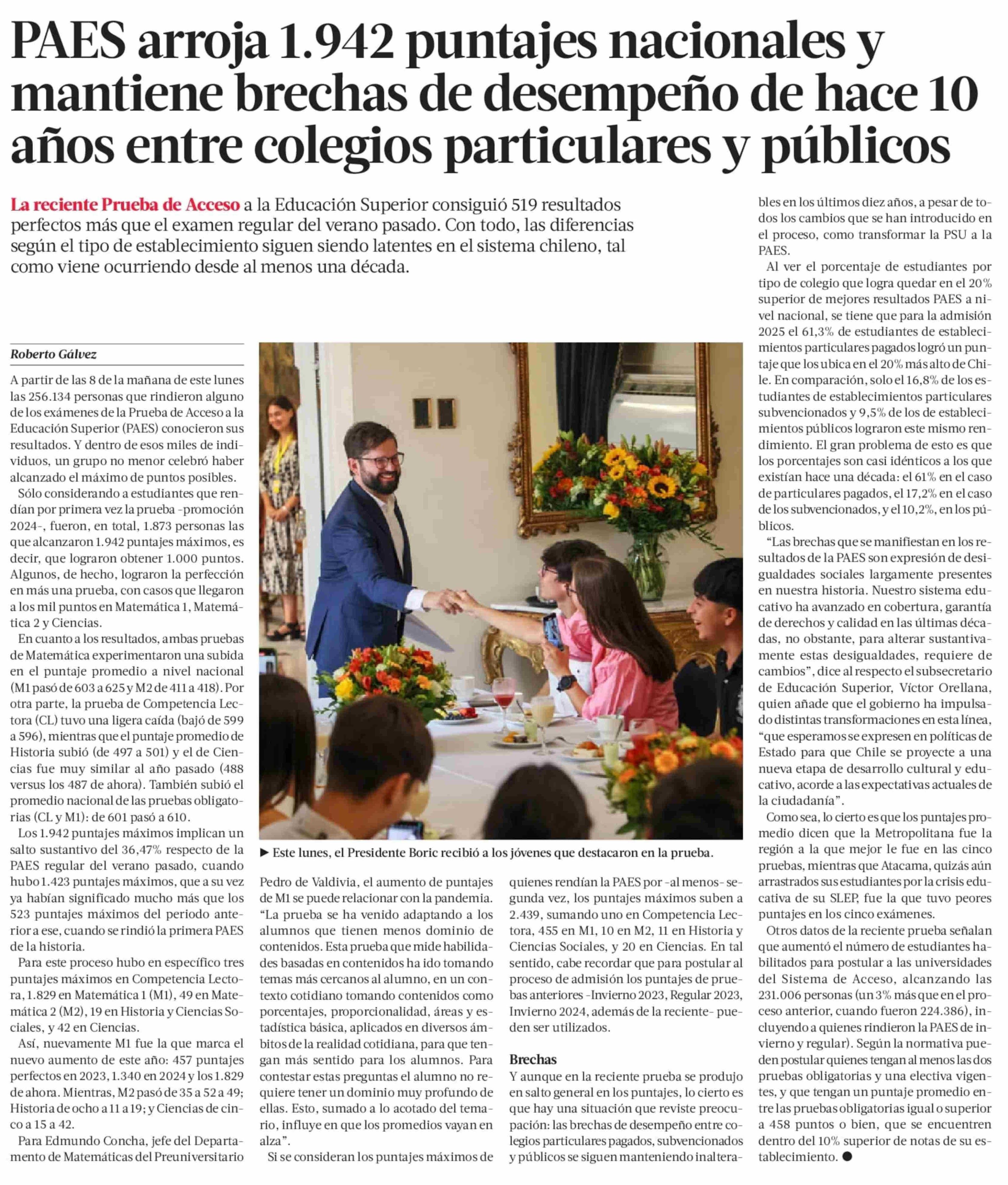 PAES arroja 1.942 puntajes nacionales y mantiene brechas de desempeño de hace 10 años entre colegios particulares y públicos