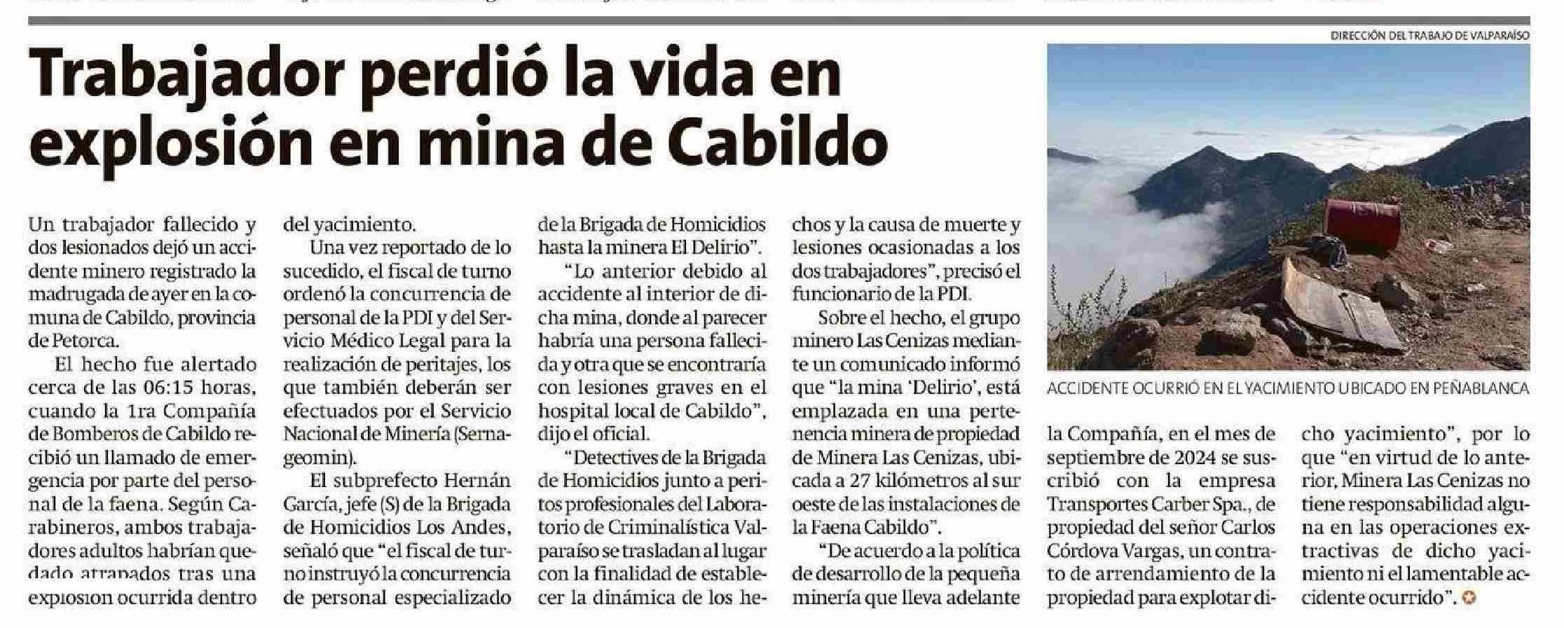 Trabajador perdió la vida en explosión en mina de Cabildo