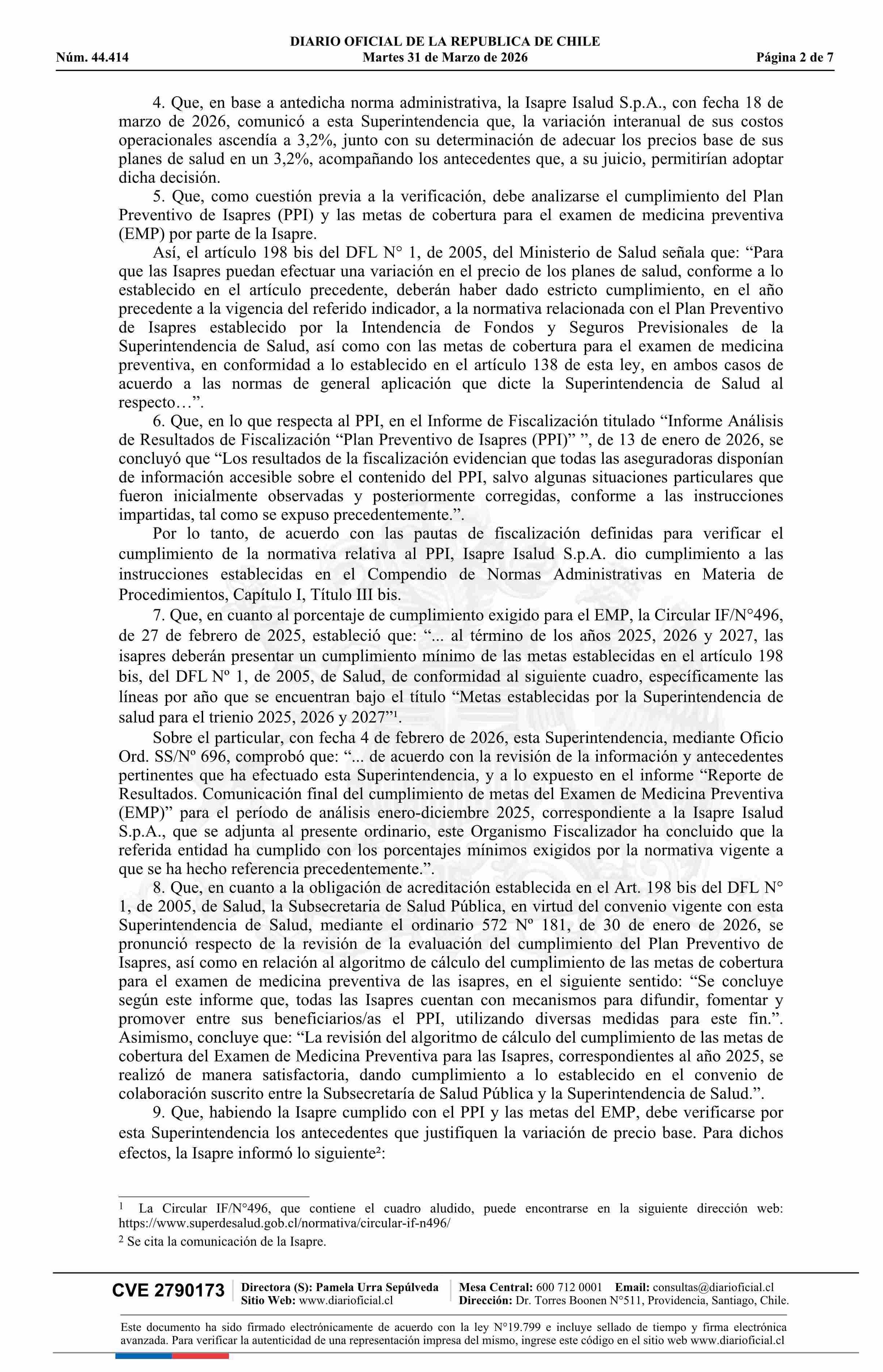 | Título: | MINISTERIO DE SALUD Superintendencia de Salud / Intendencia de Fondos y Seguros Previsionales de Salud AUTORIZA EL AJUSTE DE LOS PRECIOS BASE DE LOS PLANES DE SALUD DE LA ISAPRE ISALUD SpA |