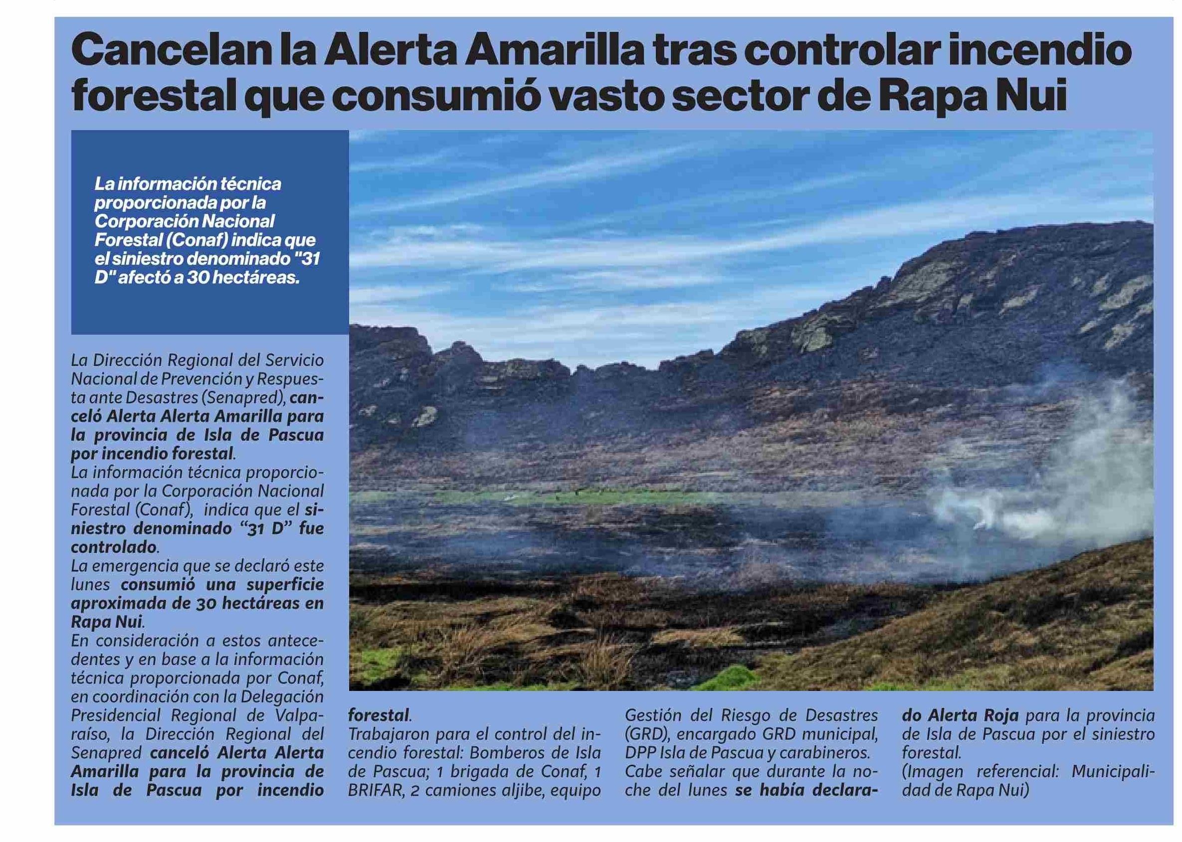 Título: Cancelan la Alerta Amarilla tras controlar incendio forestal que consumió vasto sector de Rapa Nui