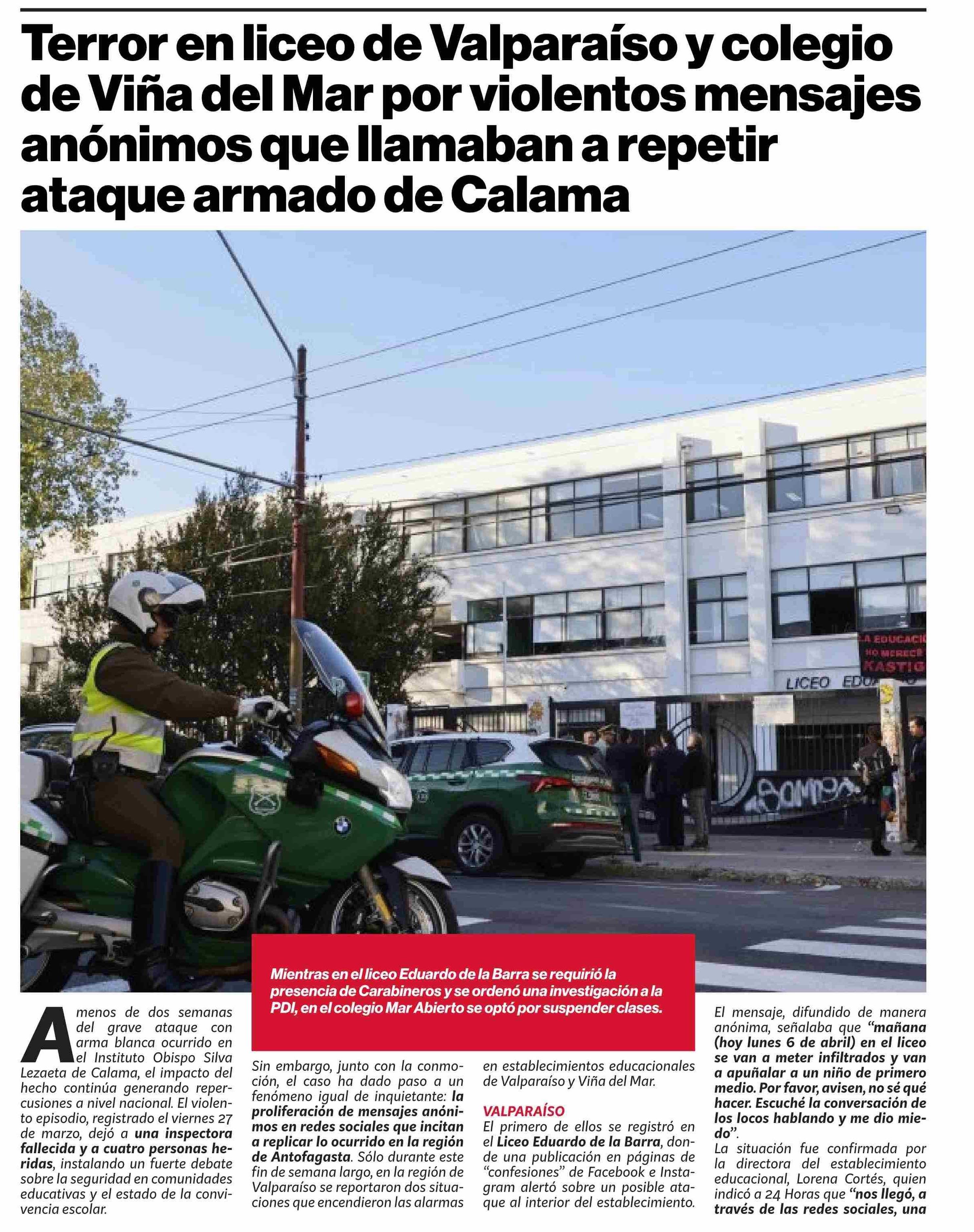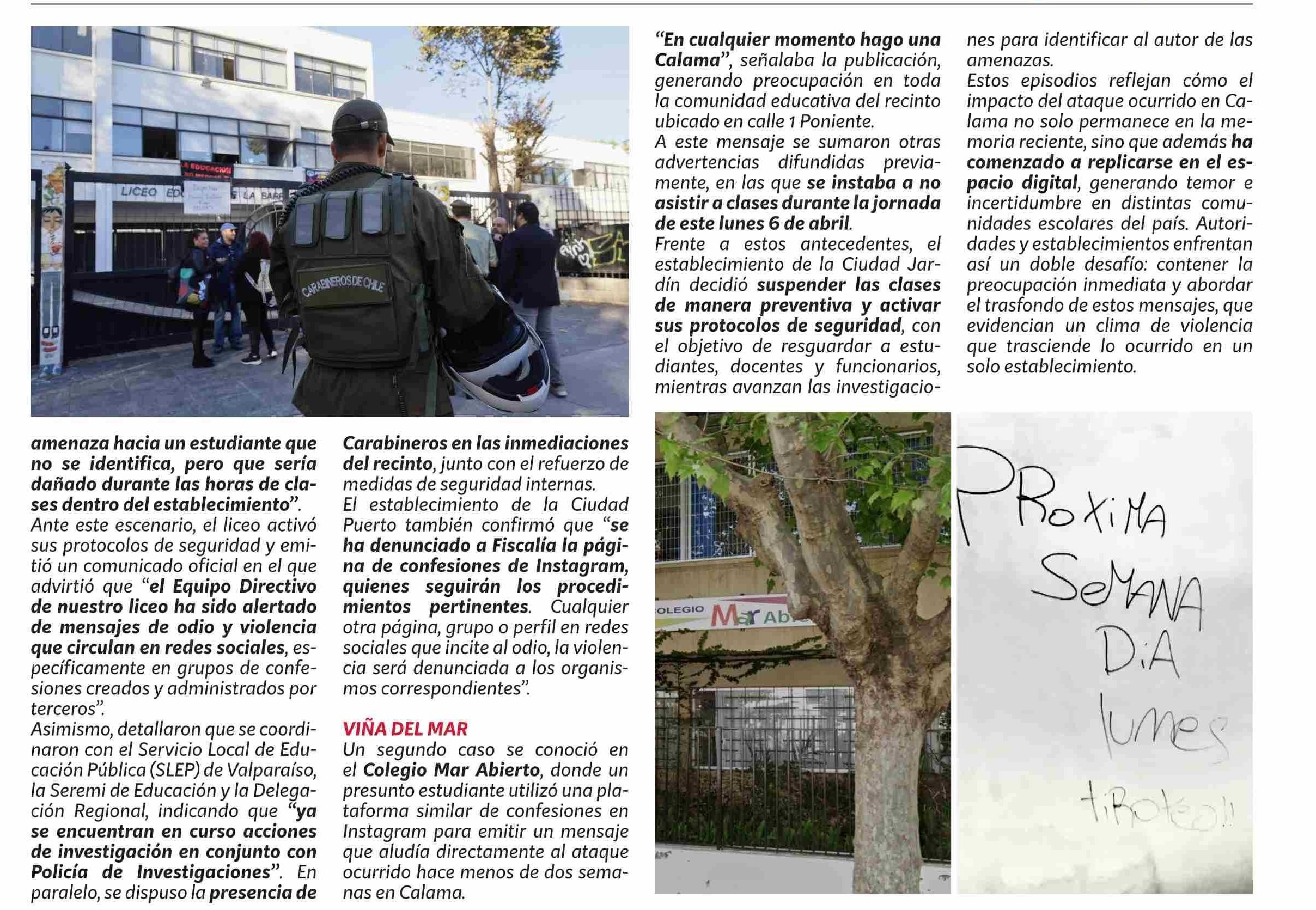 Terror en liceo de Valparaíso y colegio de Viña del Mar por violentos mensajes anónimos que llamaban a repetir ataque armado de Calama
