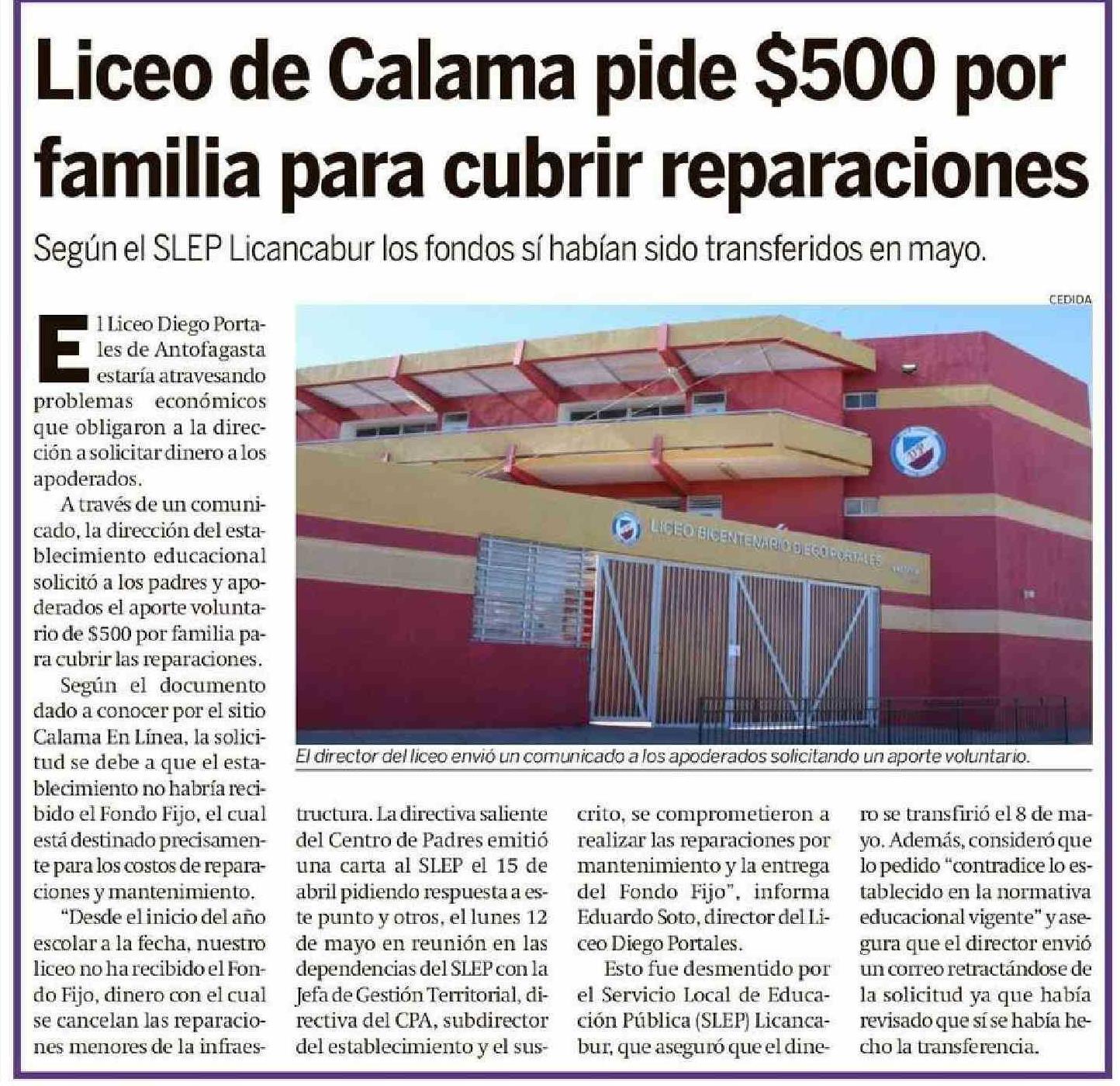 Liceo de Calama pide $500 por familia para cubrir reparaciones