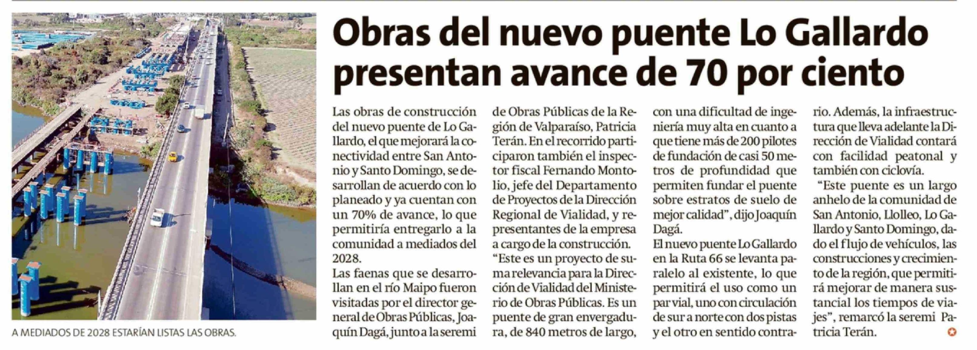 Obras del nuevo puente Lo Gallardo presentan avance de 70 por ciento