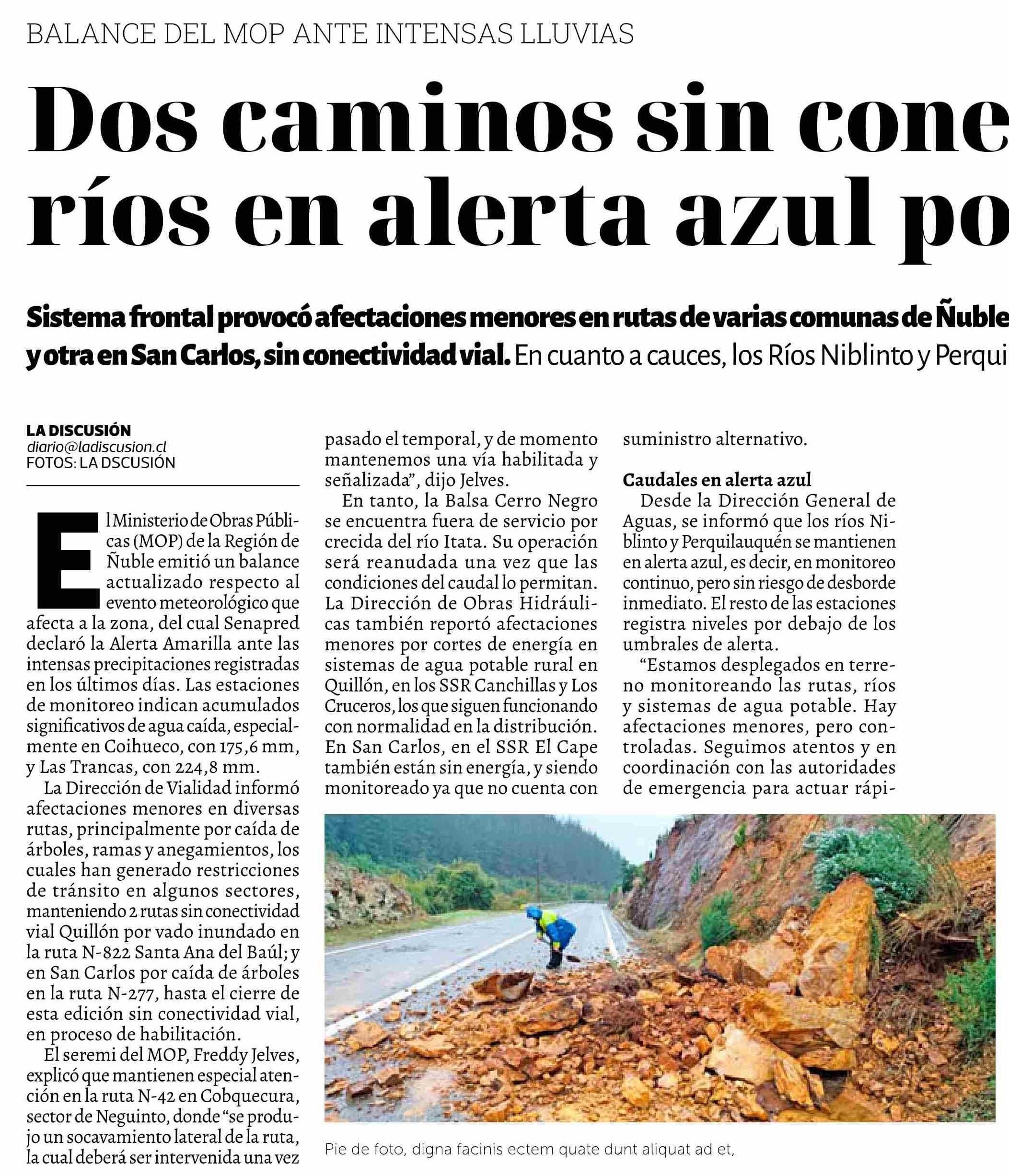 Dos caminos sin conectividad y ríos en alerta azul por crecidas