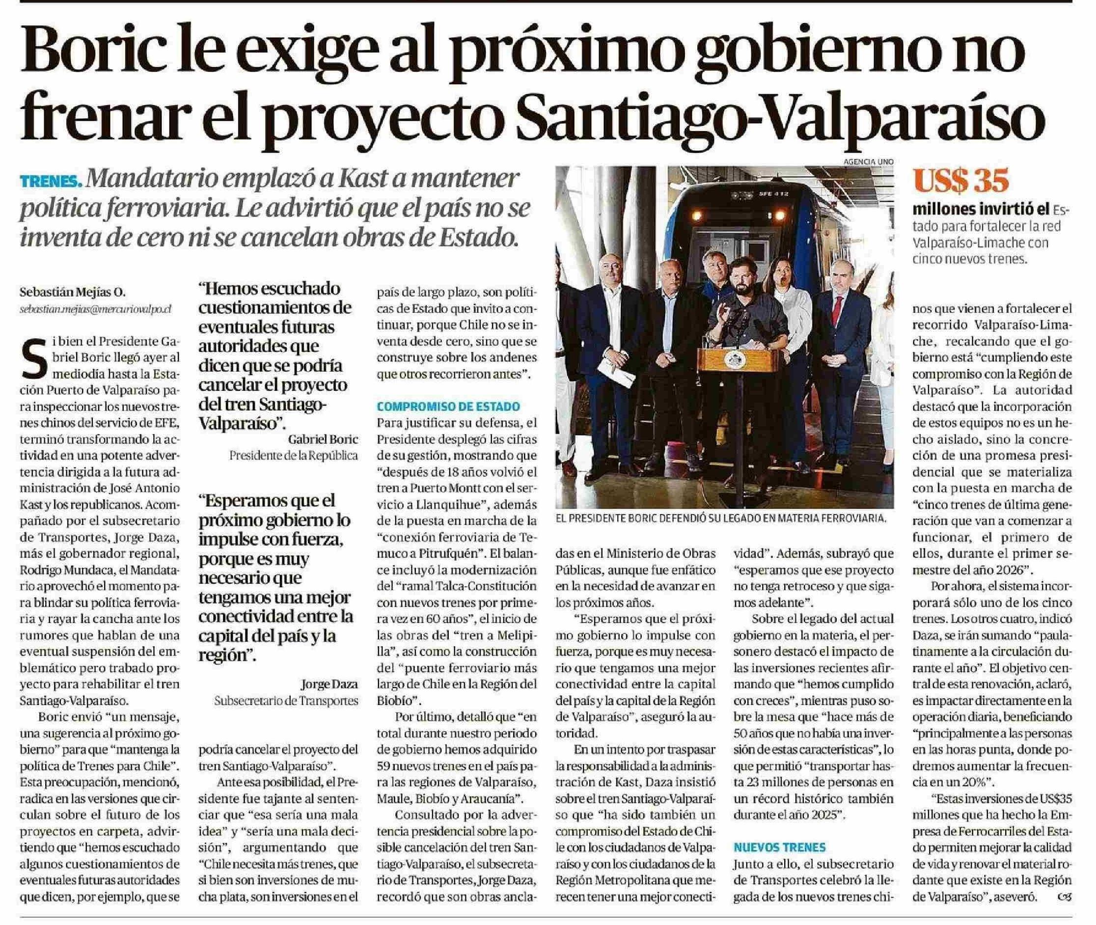 Boric le exige al próximo gobierno no frenar el proyecto Santiago-Valparaíso