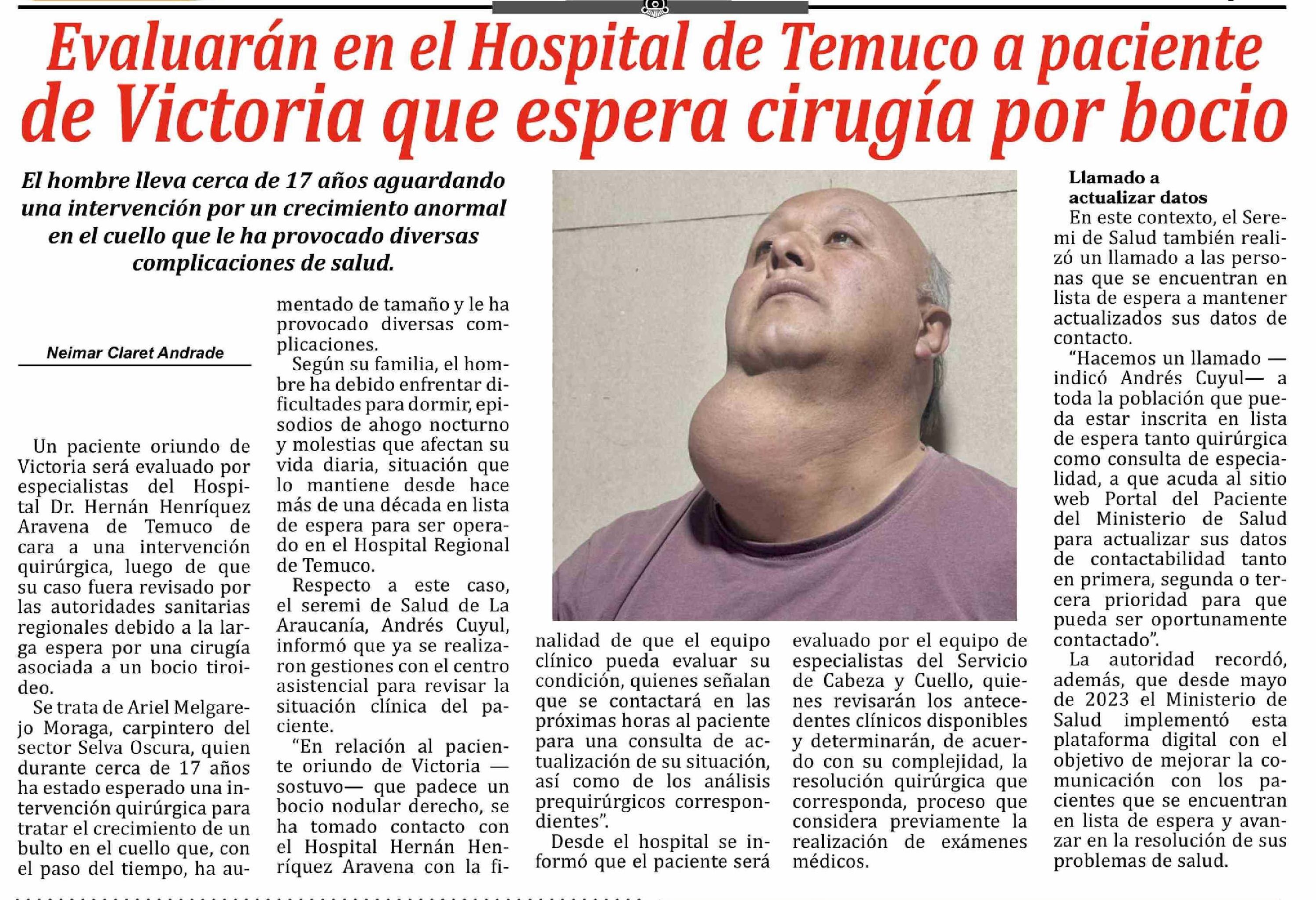 Título: Evaluarán en el Hospital de Temuco a paciente de Victoria que espera cirugía por bocio