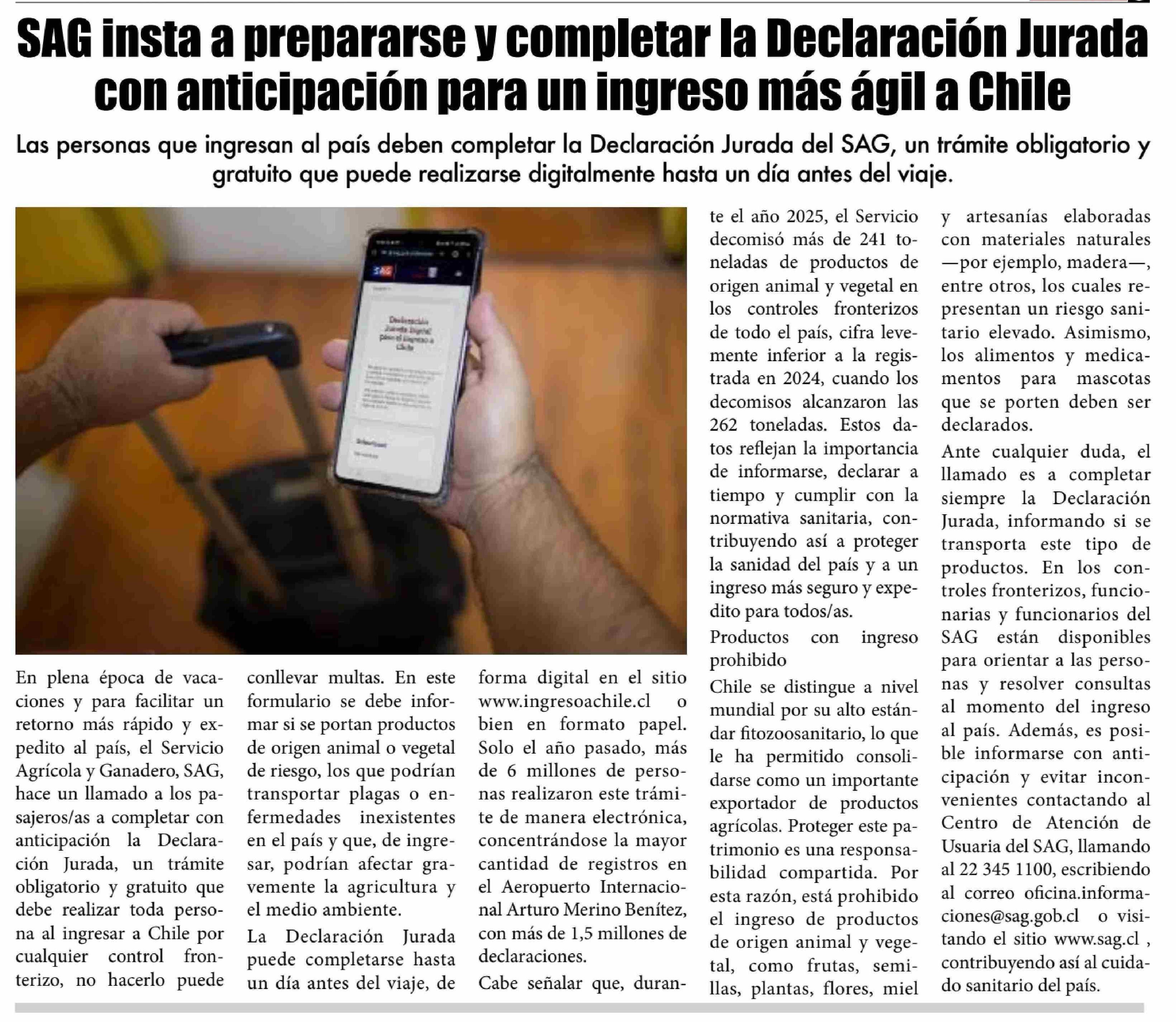 SAG insta a prepararse y completar la Declaración Jurada con anticipación para un ingreso más ágil a Chile