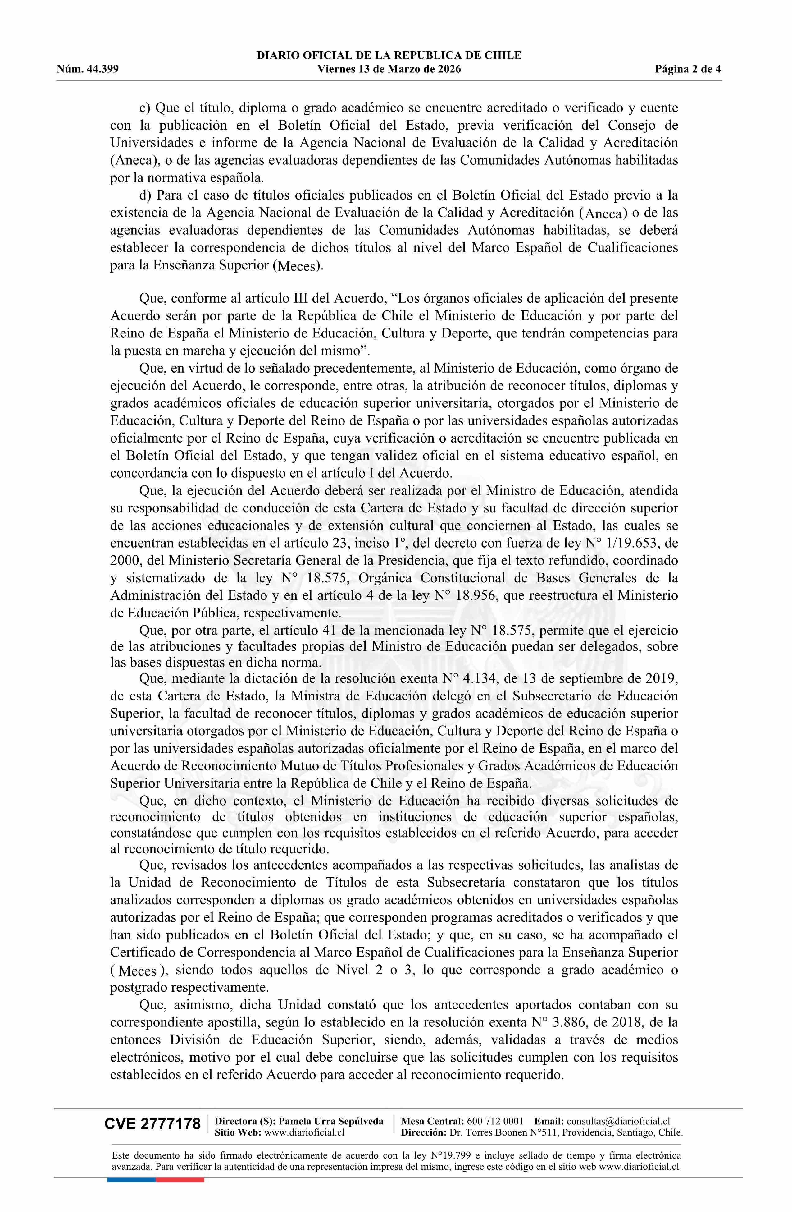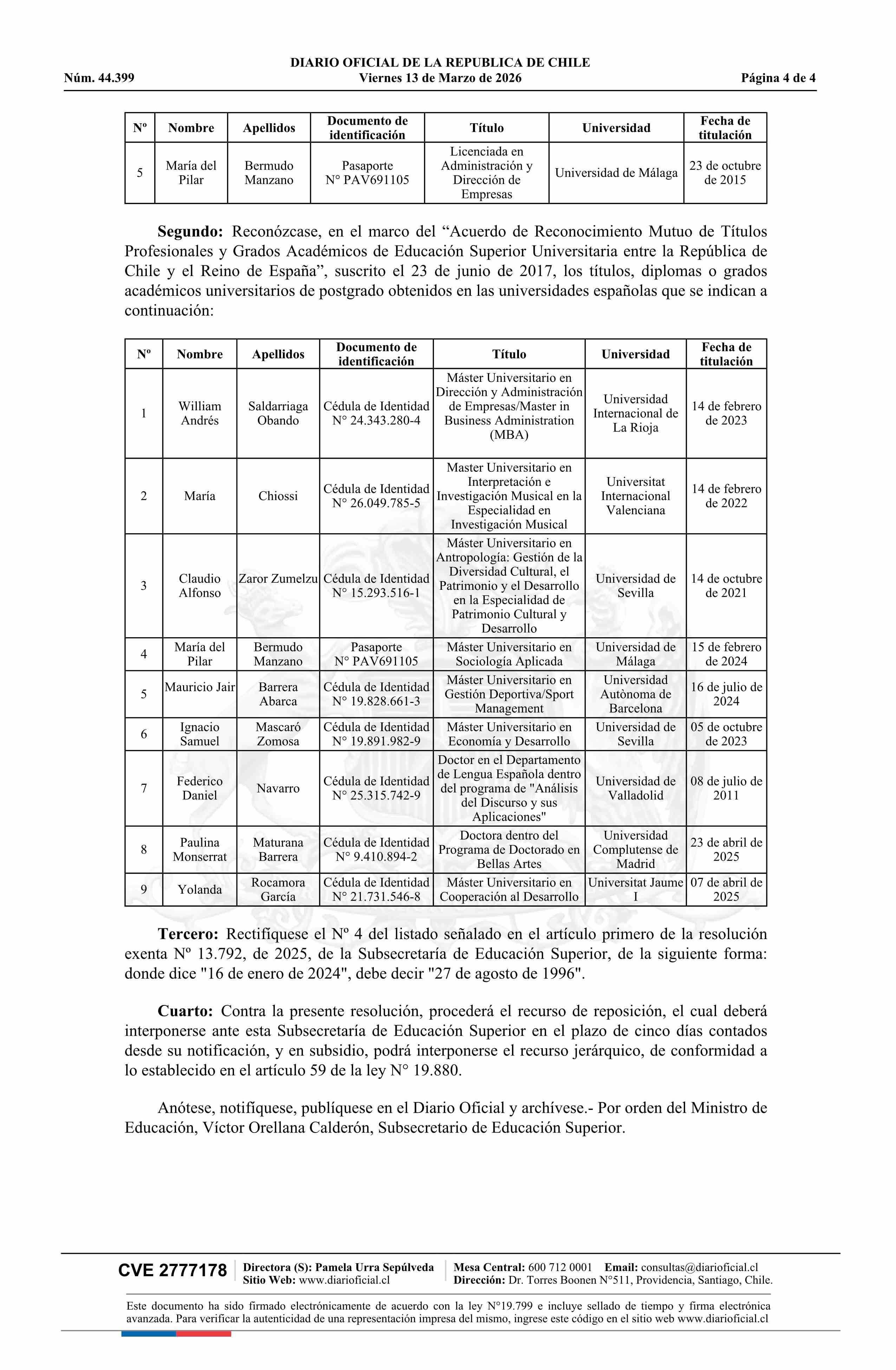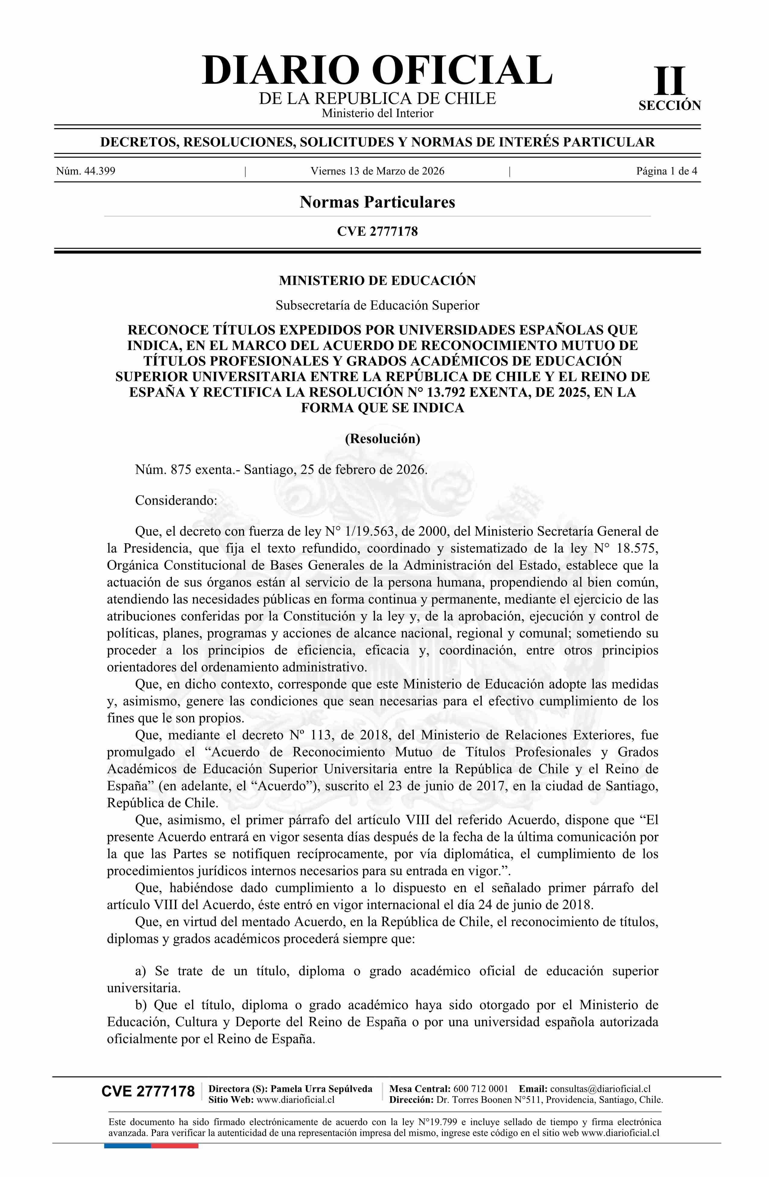 Título: Resolución exenta número 875, de 2026.- Reconoce títulos expedidos por universidades españolas que indica, en el marco del Acuerdo de Reconocimiento Mutuo de Títulos Profesionales y Grados Académicos de Educación Superior Universitaria entre la República de Chile y el Reino de España, y rectifica la