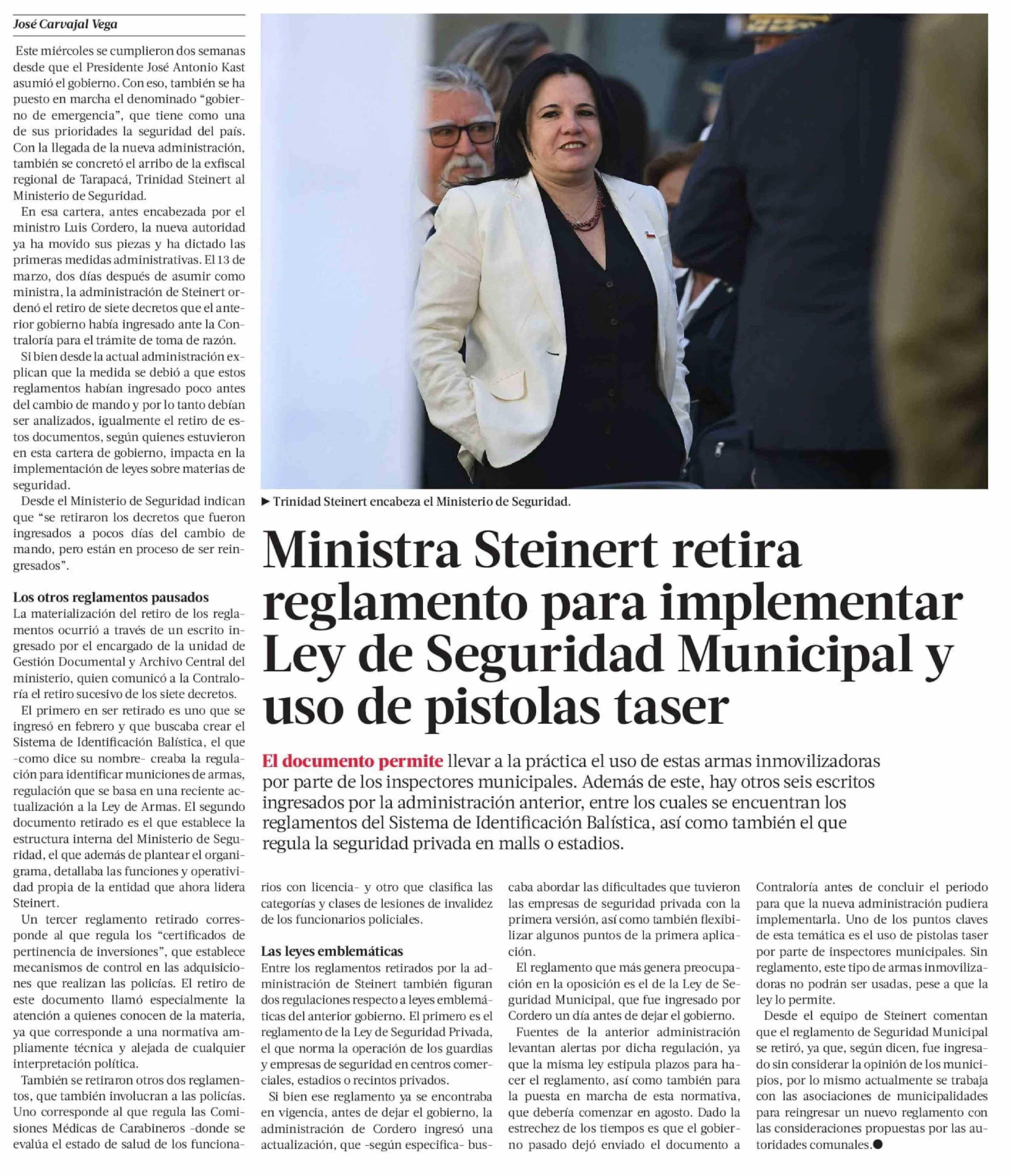 Ministra Steinert retira reglamento para implementar Ley de Seguridad Municipal y uso de pistolas taser