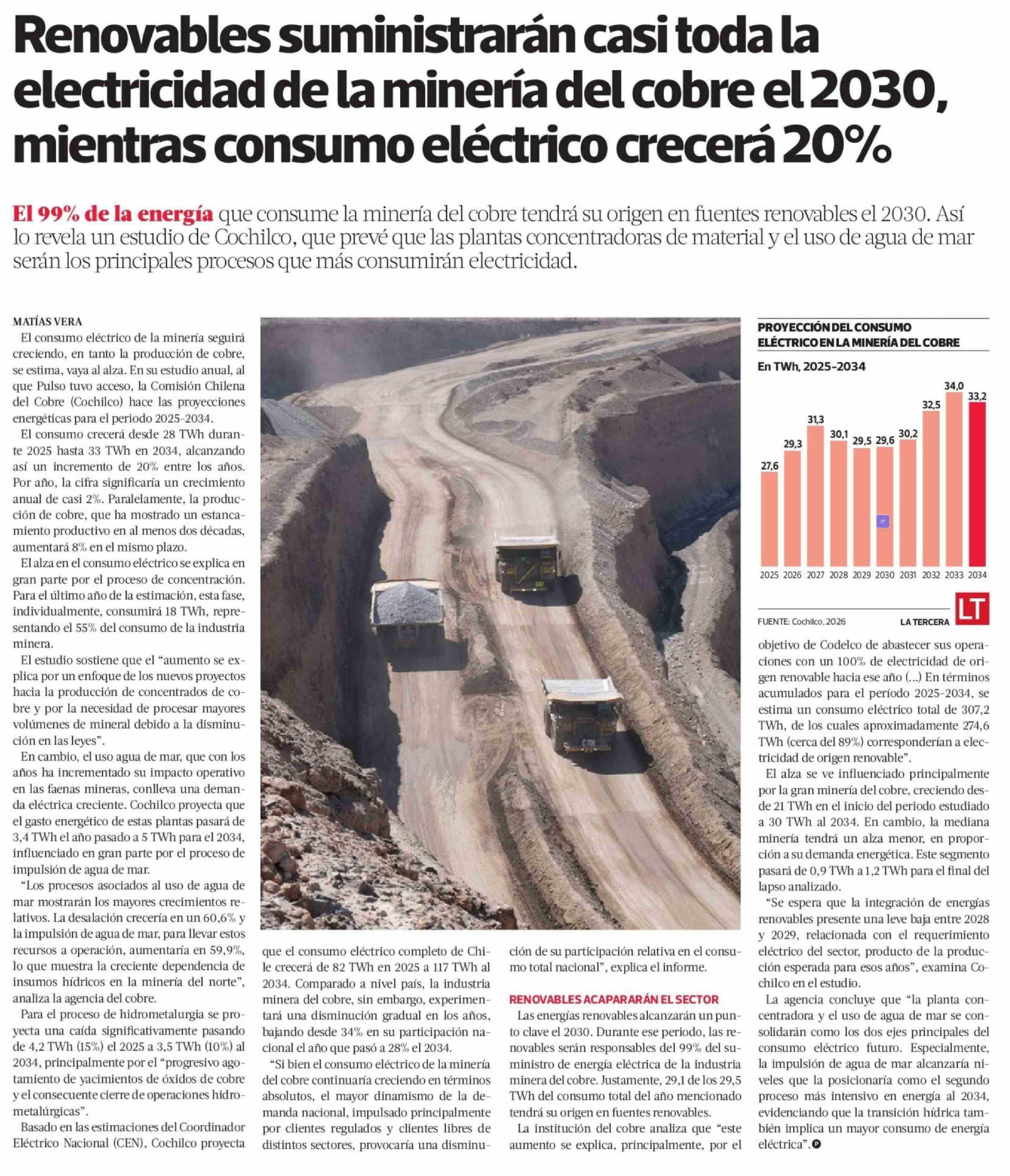 Renovables suministrarán casi toda la electricidad de la minería del cobre el 2030, mientras consumo eléctrico crecerá 20%