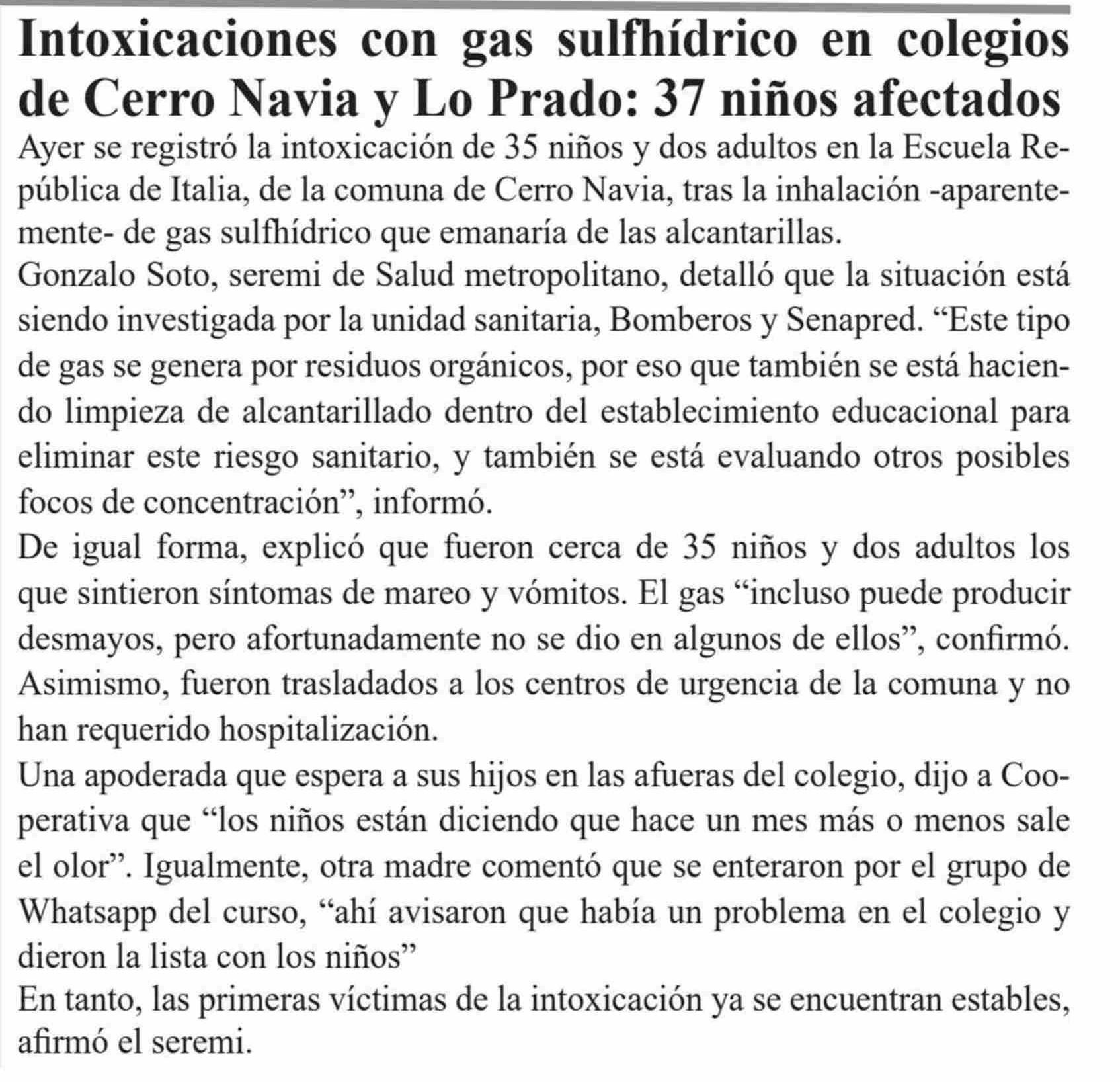 Intoxicaciones con gas sulfhídrico en colegios de Cerro Navia y Lo Prado: 37 niños afectados