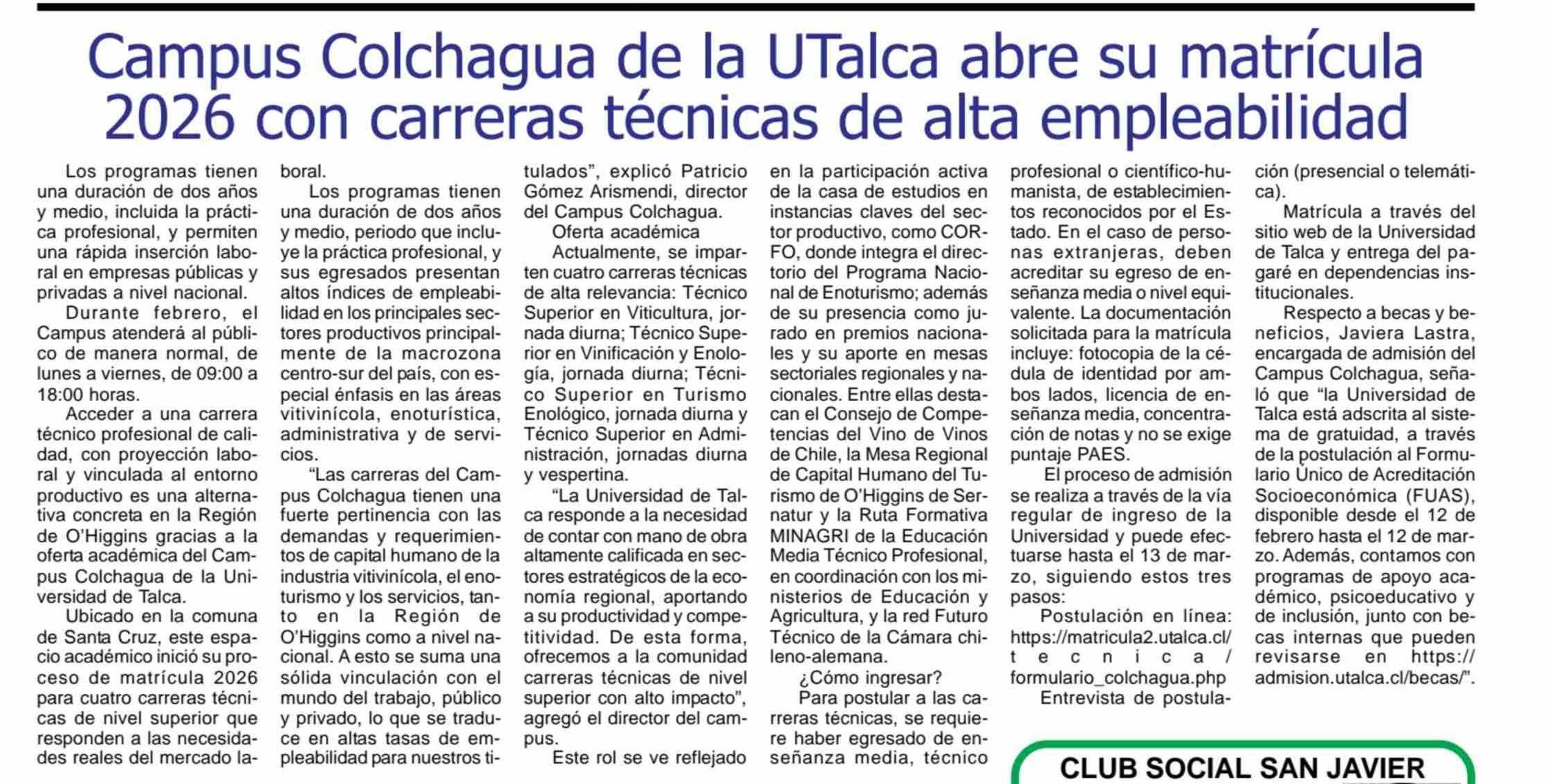 Campus Colchagua de la UTalca abre su matrícula 2026 con carreras técnicas de alta empleabilidad