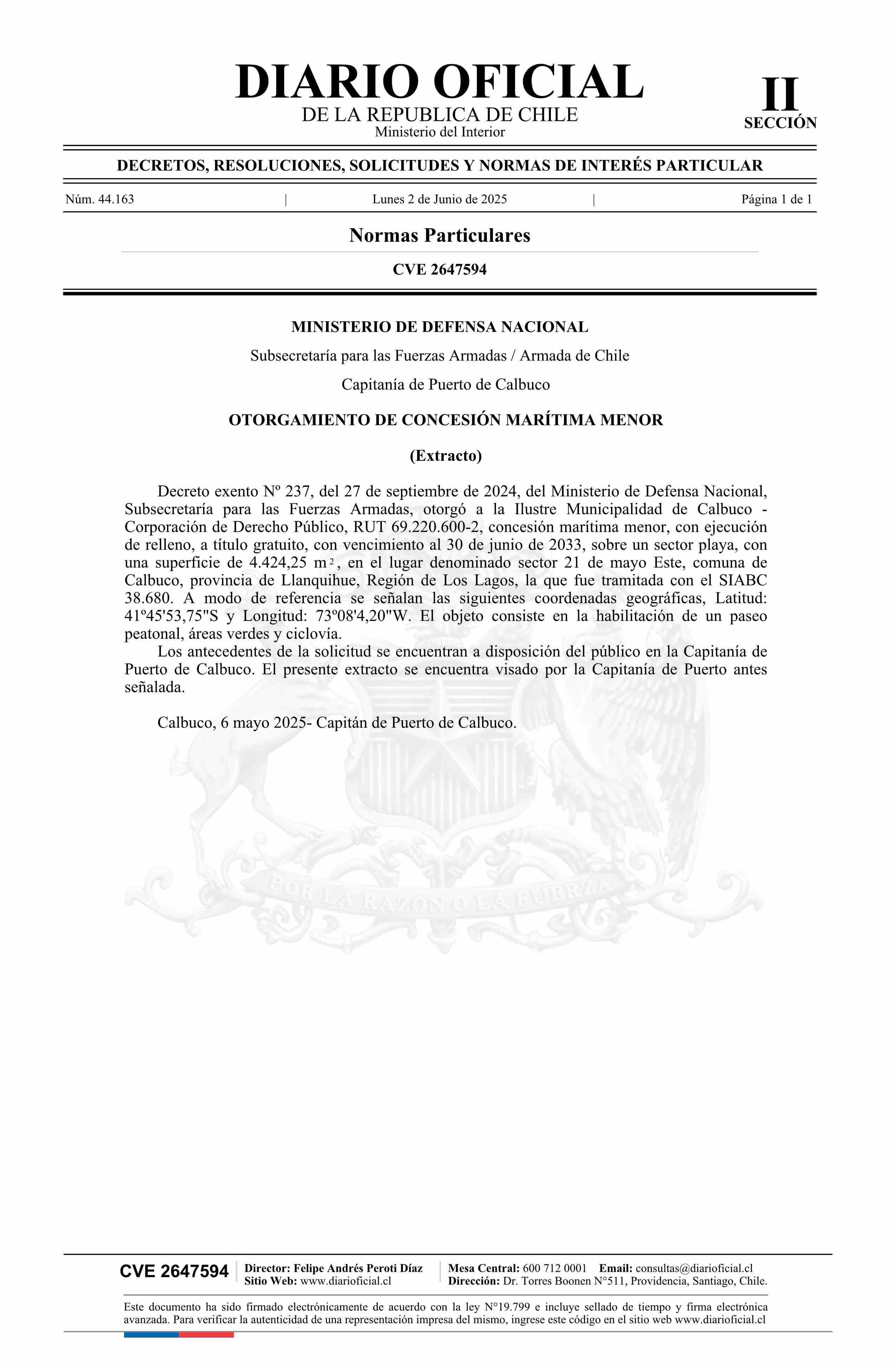 Extracto de decreto número 237, de 2024.- Otorgamiento de concesión marítima menor