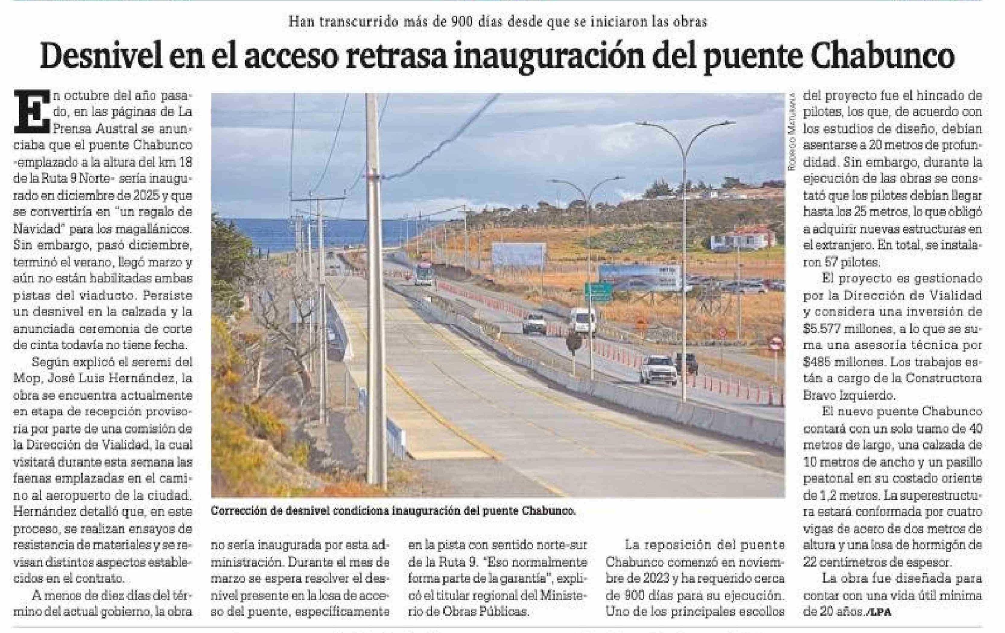 Desnivel en el acceso retrasa inauguración del puente Chabunco