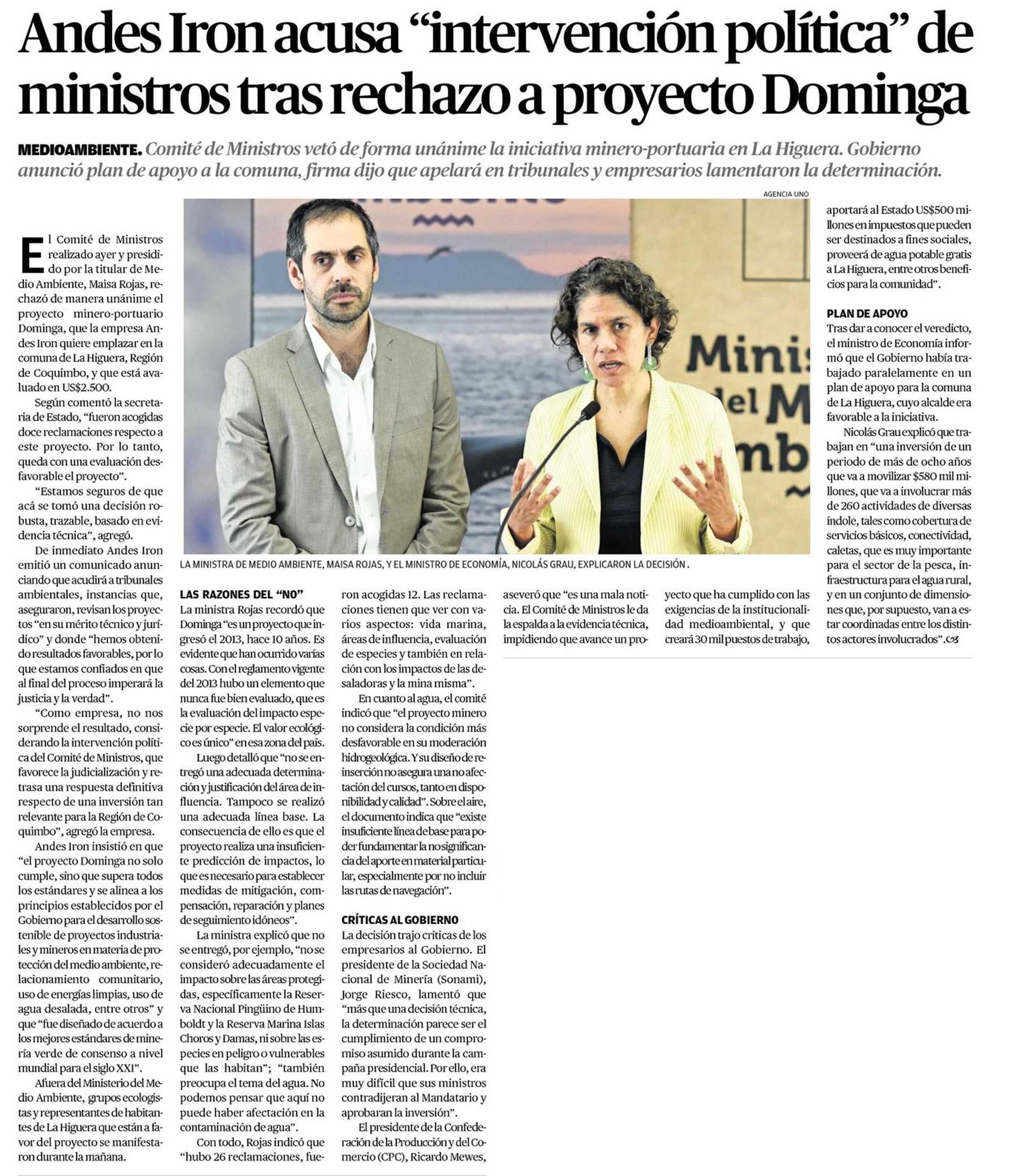 Andes Iron acusa “intervención política” de ministros tras rechazo a proyecto Dominga