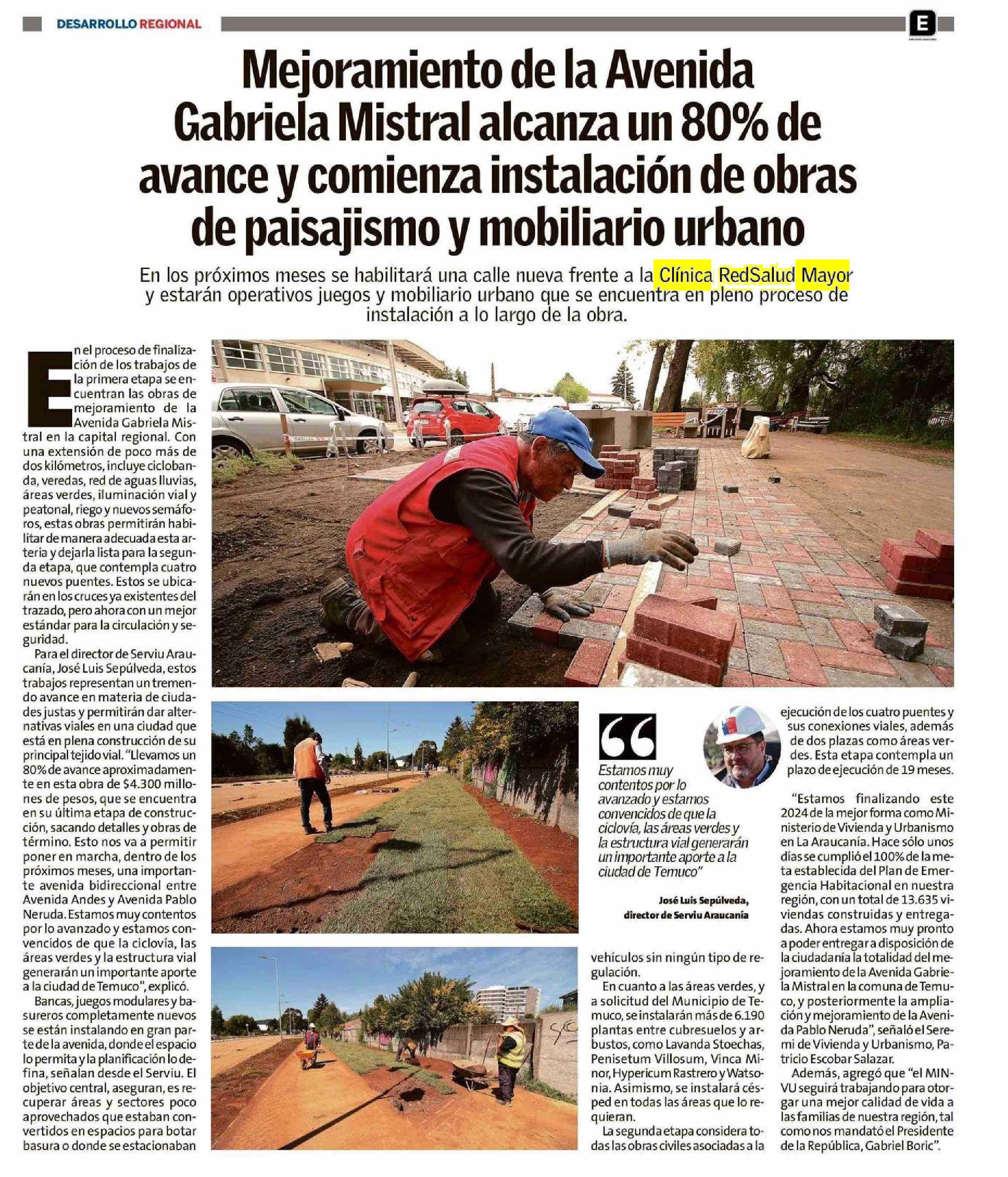 | Título: | PAIS Mejoramiento de la Avenida Gabriela Mistral alcanza un 80% de avance y comienza instalación de obras de paisajismo y mobiliario urbano |