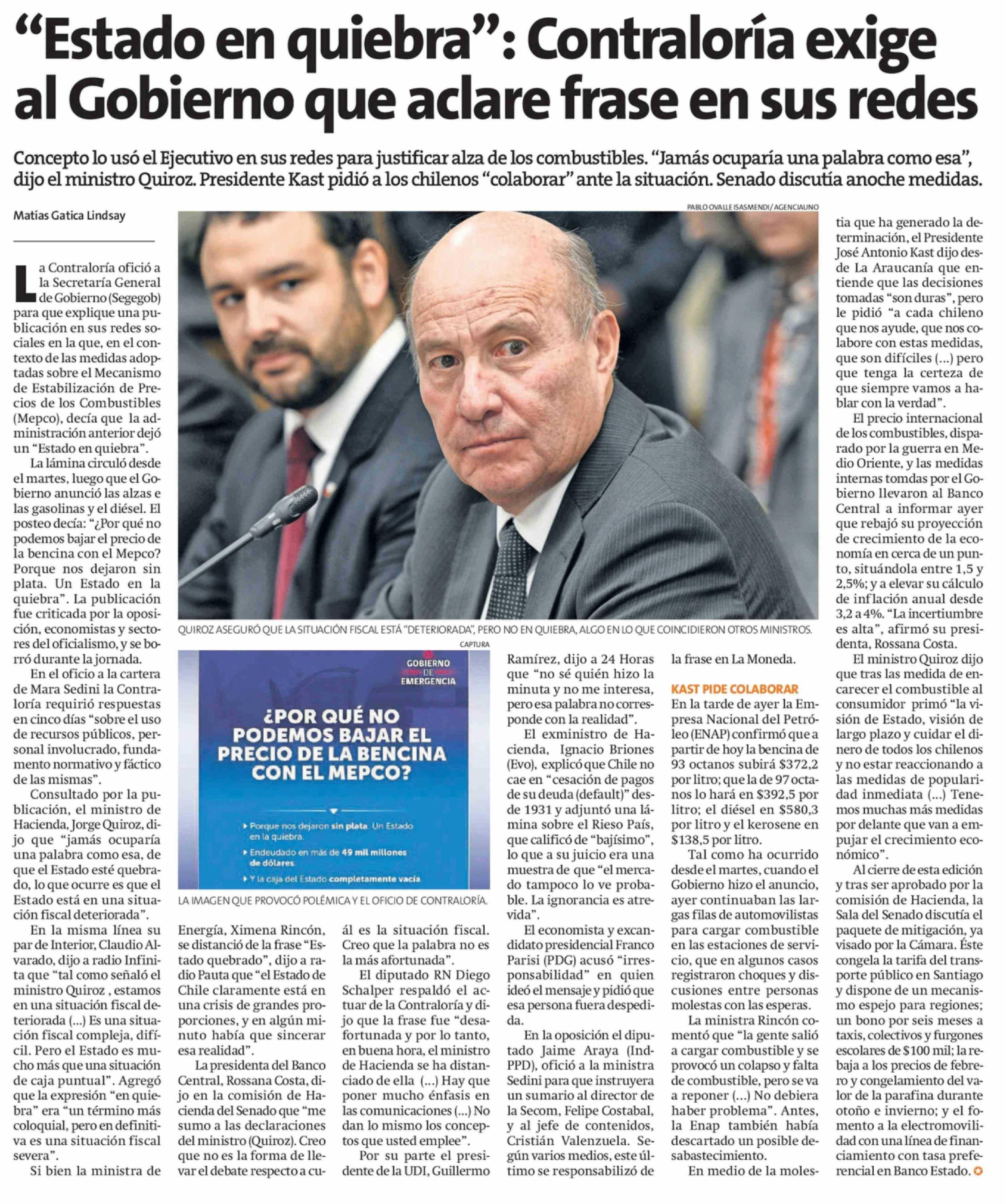 "Estado en quiebra": Contraloría exige al Gobierno que aclare frase en sus redes
