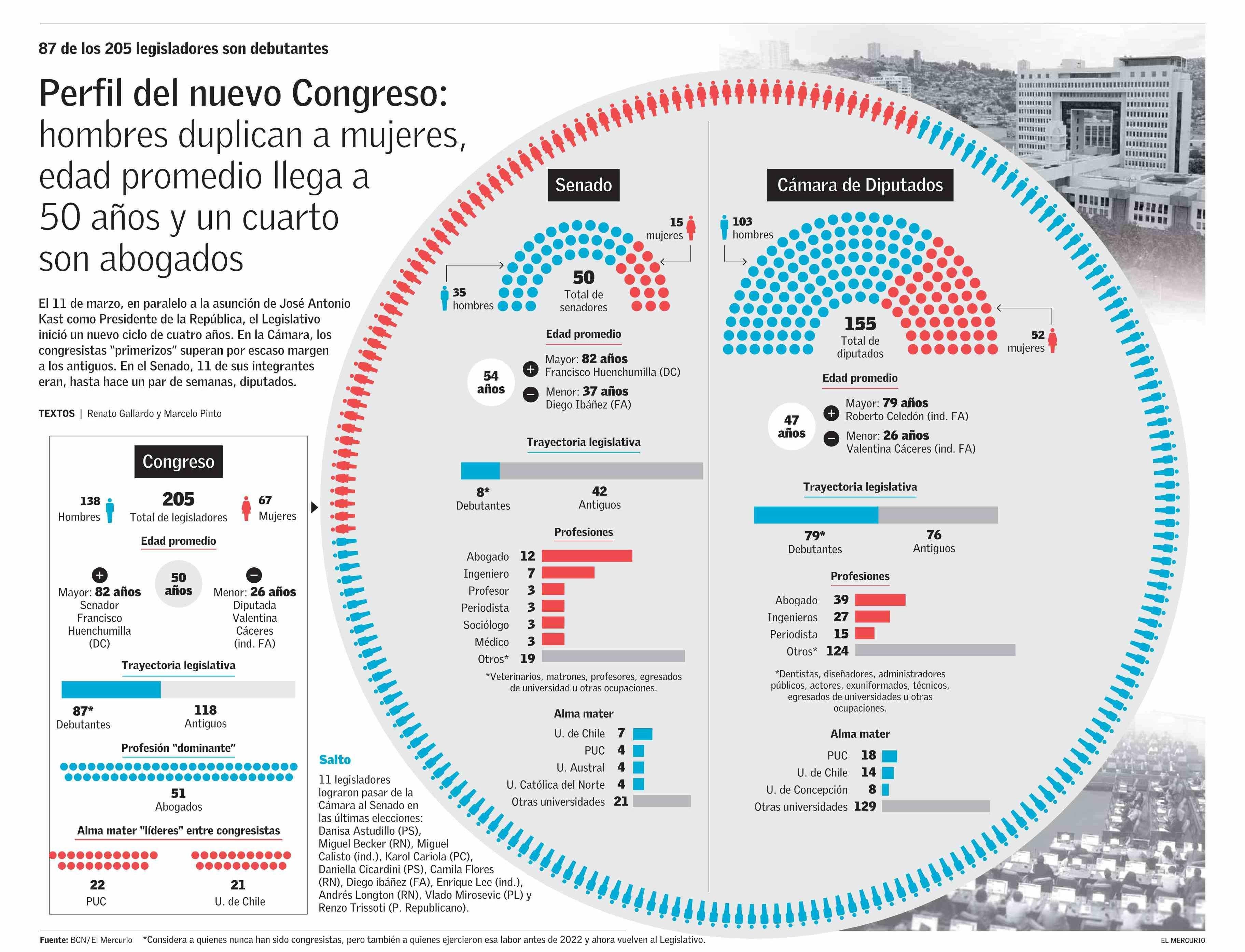 Perfil del nuevo Congreso: hombres duplican a mujeres, edad promedio llega a 50 años y un cuarto son abogados