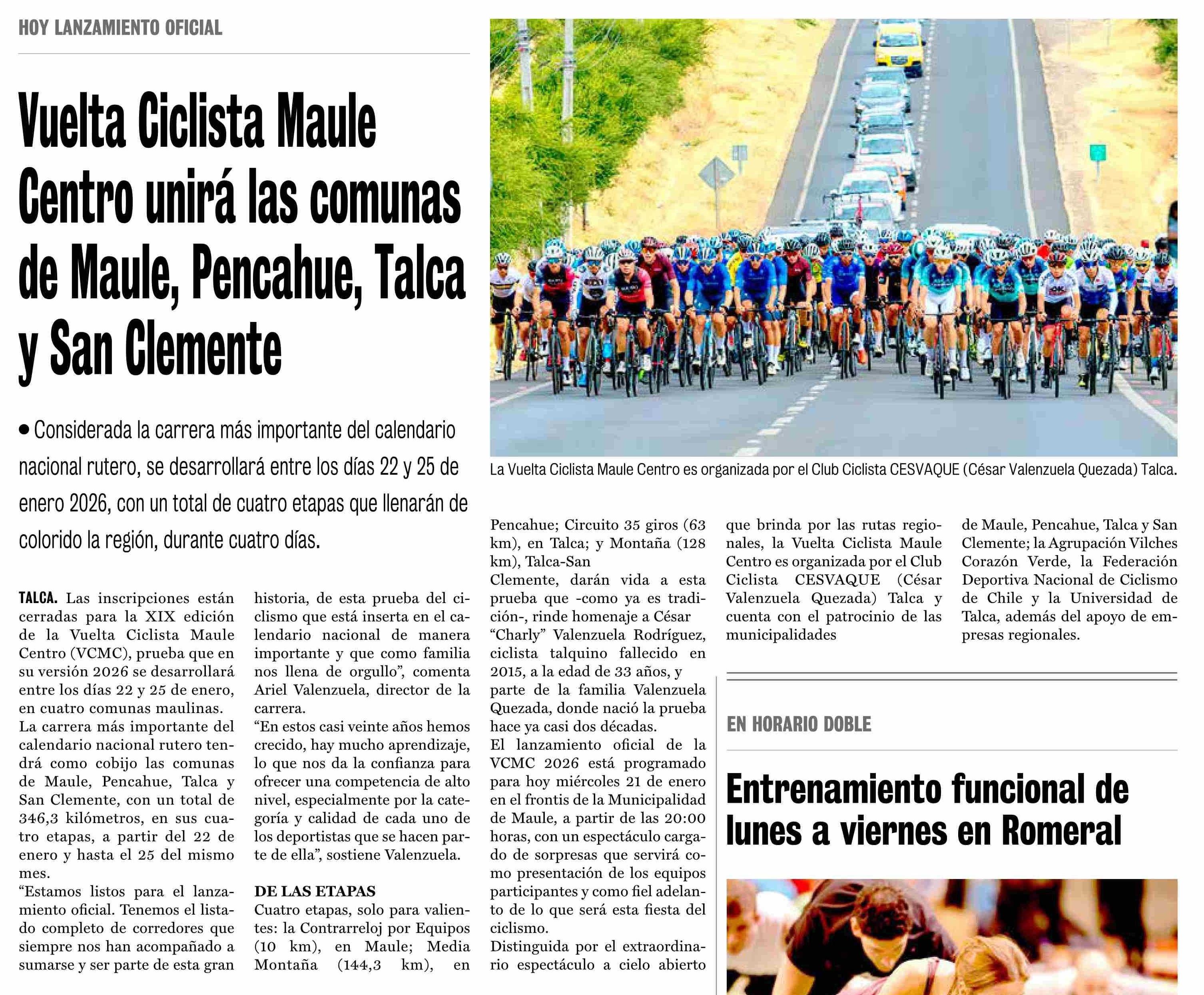 Vuelta Ciclista Maule Centro unirá las comunas de Maule, Pencahue, Talca y San Clemente