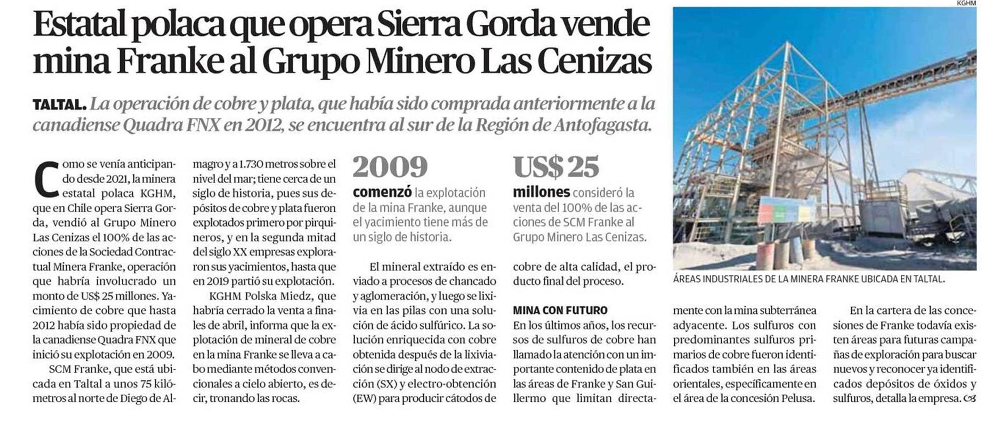 Estatal polaca que opera Sierra Gorda vende mina Franke al Grupo Minero Las Cenizas