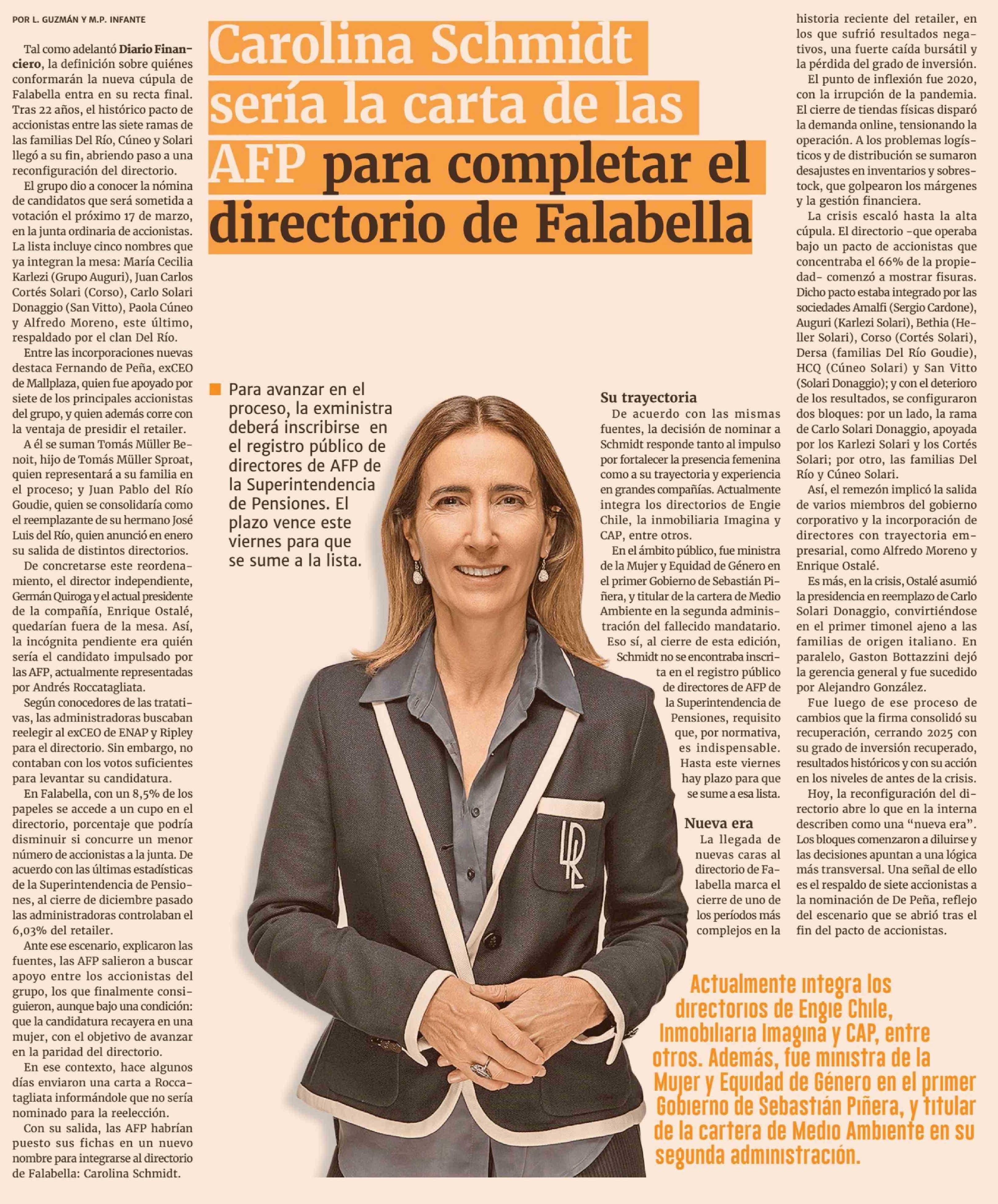 Carolina Schmidt sería la carta de las AFP para completar el directorio de Falabella