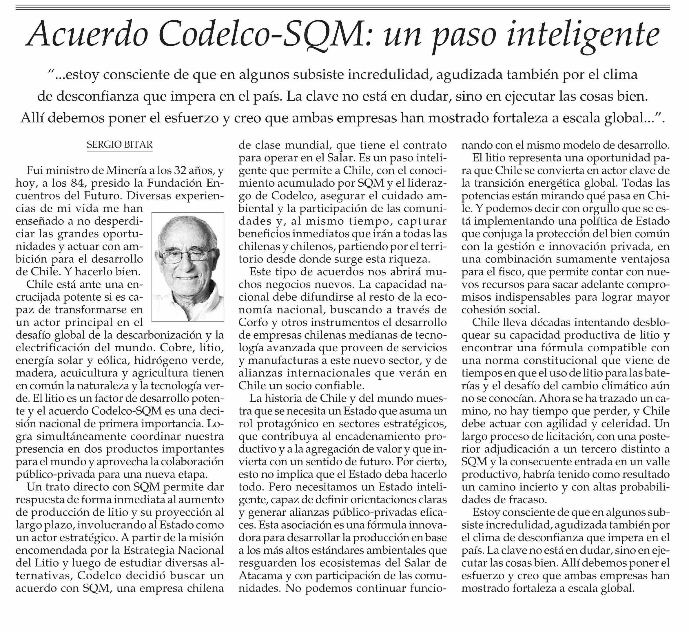 COLUMNAS DE OPINIÓN: Acuerdo Codelco-SQM: un paso inteligente